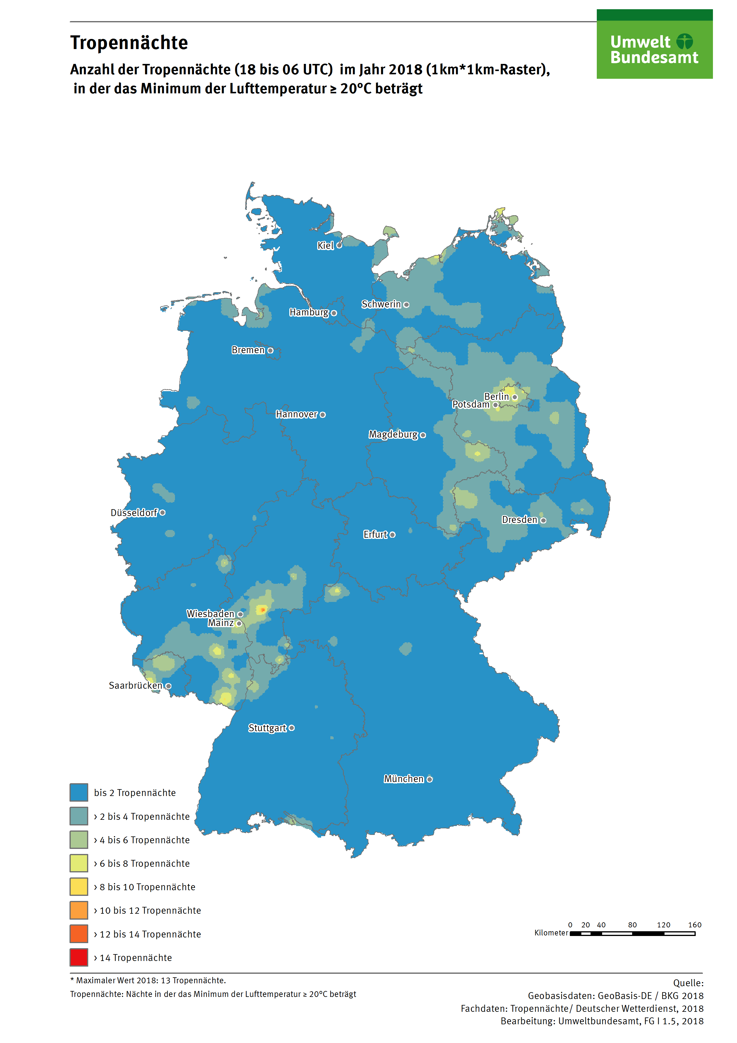 Karte: Tropennächte - Anzahl der Tropennächte (18 bis 06 UTC) im Jahr 2018