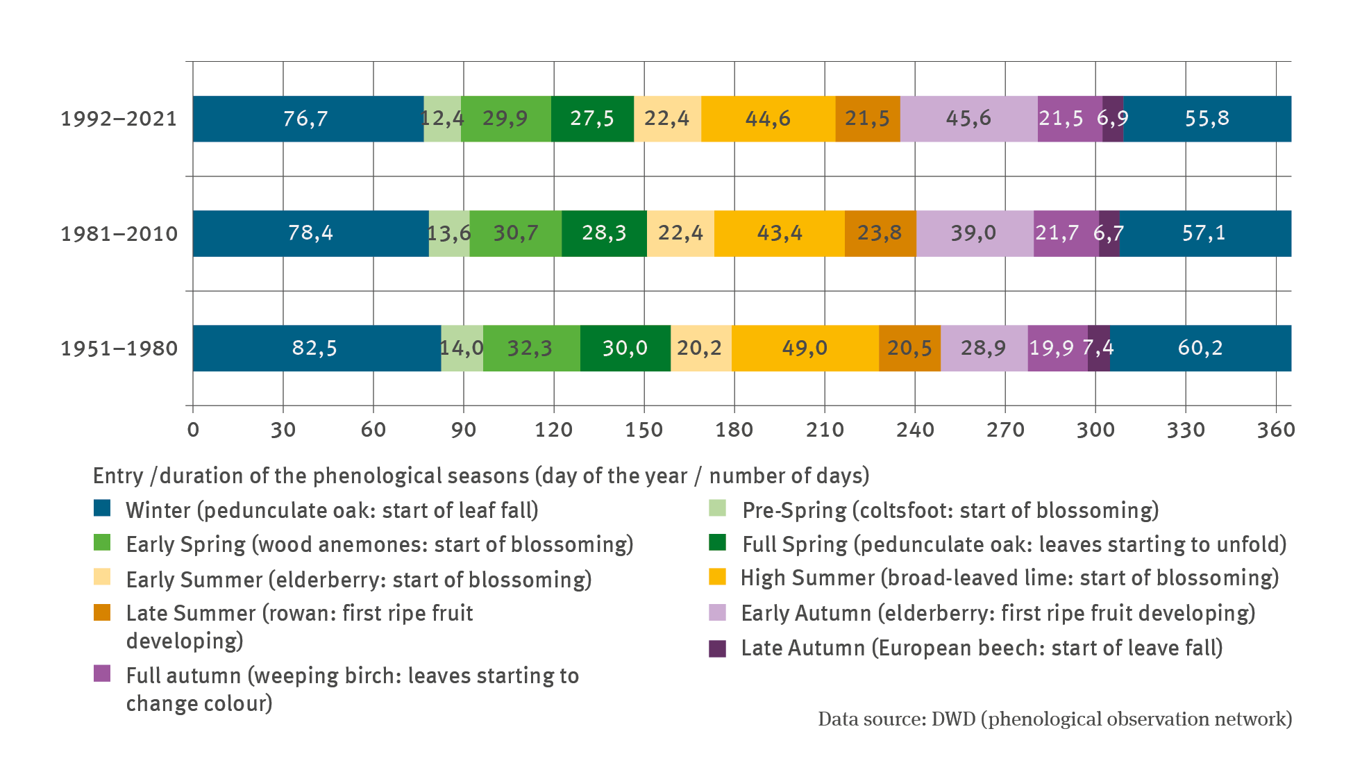 The interpretation of shifts in seasonal cycles can only produce reliable results if this is done over extended sequences. This is why phenological data as well as climate-related data are averaged over periods of 30 years. Using the so-called phenological clock to compare the mean starting points of phenological seasons for the reference period of 1951 to 1980 and the comparative period of 1981 to 2010 with the starting points of the period from 1992 to 2021, the following pattern emerges: Regarding the phenological seasons from pre-spring via early summer until early autumn, the two periods after 1981 started earlier than in the reference period of 1951 to 1980 whereas the seasons of autumn, late autumn and winter started later. Pre-spring is the only time when the statistical difference is not significant. This means that especially the early autumn in the mean of the years 1992 to 2021 was approximately 17 days longer than in the reference period 1951 to 1980 whereas the winter season was approximately ten days shorter compared to the winter seasons between 1951 and 1980. This comparison also demonstrates that the summer mean of the threeperiods in question remained almost unchanged amounting to approximately 90 days whereas the beginning and end of summer in the period 1992 to 2021 was on average approximately twelve days earlier than in the reference period 1951 to 1980. An analysis of the starting dates of phenological seasons in the period 1992 to 2021 compared to the reference period 1951 to 1980 reveals statistically significant – and in most cases highly significant – differences between the two periods for all seasons.