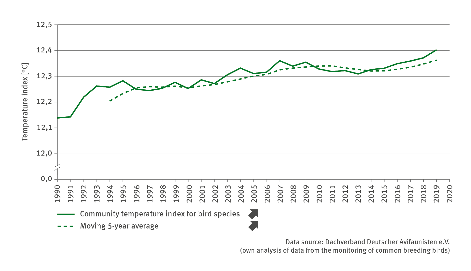 In the period between 1990 and 2019, such a development has been observed in 88 bird species breeding in Germany. As indicated by the temperature index for frequently occurring breeding bird species, the relative frequencies of the birds observed have shifted in this period in favour of thermophilic species or, putting it another way, the relative frequencies shifted to the detriment of cold-tolerant species. From 1994 onwards, the moving 5-year average of the temperature index first shows an increase taking place until approximately 2010, but this was followed by a slightly retrograde development by 2013, whereas this was in turn followed by a distinct increase. However, the development between 2010 and 2013 can be attributed in the first place to effects of weather patterns which had an impact regardless of the long-term climatic trend. In the years 2009 / 2010 to 2012 / 13 there were several consecutive hard winters with adverse effects on many breeding bird populations. The developments since 2013 show that the more long-term positive trend reflected by the indicator has continued despite short-term levelling impacts from a number of hard winters between 2009 and 2013. Nevertheless, it is clear that despite progressive climatic warming, the incidence of extreme weather events is of major importance to ecological change processes.