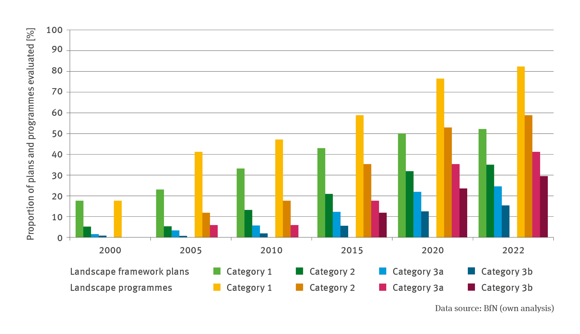 As shown by an evaluation of 16 landscape programmes operated by Länder and the available landscape framework plans – there were 155 in 2020 – the impacts of climate change and the resulting requirements in terms of planning are not yet taken into consideration widely. However, as far as those plans are concerned that were analysed in respect of the period from 2000 and 2020, a distinct increase is noticeable in references to climate change. For example, climate change and themes relating to climate protection and adaptation to climate change in connection with nature conservation issues have been mentioned in slightly more than three quarters (76 %) of landscape programmes. The process of evaluation included statements made in the plans relating to land with both storage and sink functions for carbon. By contrast, a clear majority of plans has so far failed to include any descriptions of tangible impacts of climate change on biodiversity. According to the 2020 status, only approximately 22 % of landscape framework plans provide a rationale for individual nature conservation objectives and measures which are at least in part associated with climate change. The analyses undertaken do not permit any detailed statements regarding the specific technical depth or consideration of climate change in the plans analysed. Nevertheless, it is evident that landscape planning at the level of Länder and regions, with a view to the challenges of climate change, has so far included only scant statements on tangible objectives and measures.
