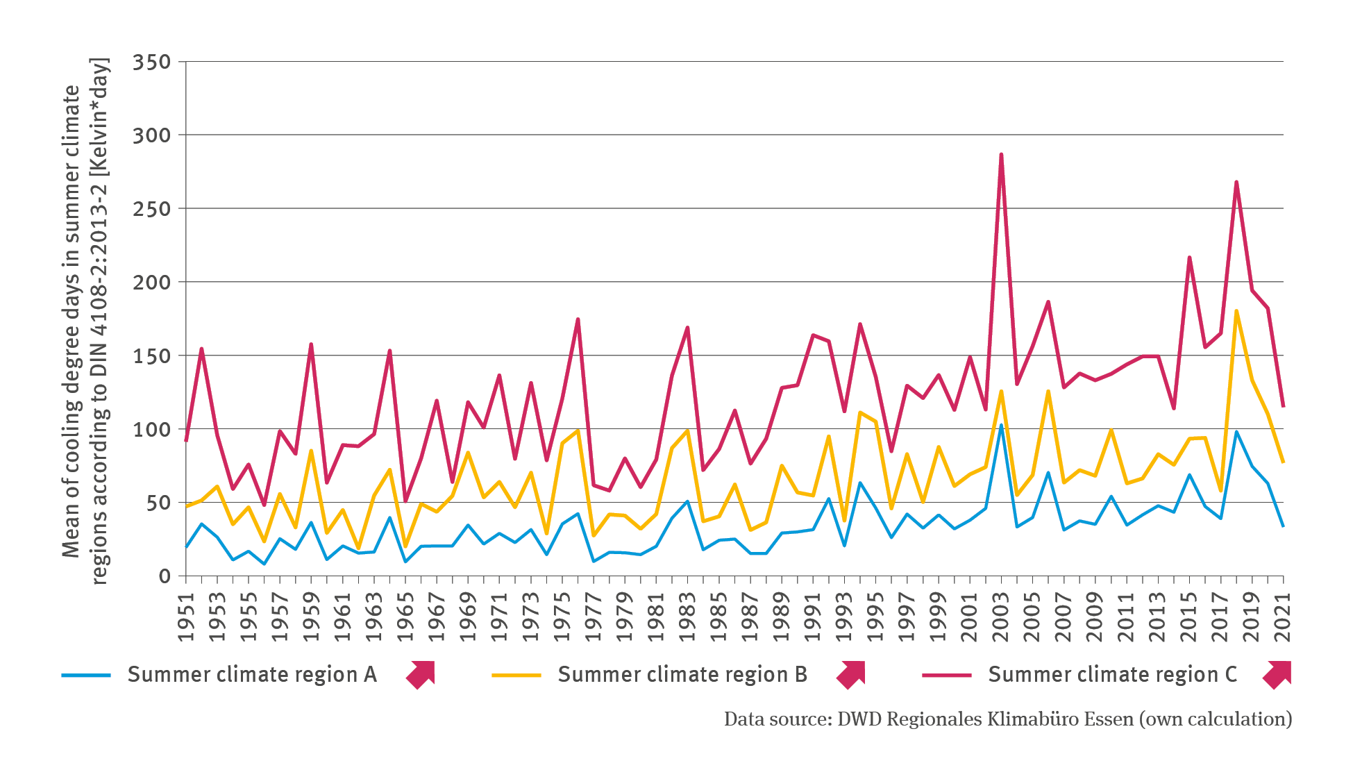 Since 1951 all three time series have shown a significantly rising trend. A comparison shows that the cooling degree days in summer climate region C (i.e. the Mannheim station) increase faster than in the two other regions. Notwithstanding the above, a comparison with the climate normal period 1961–1990 shows that since 1999 the cooling degree days in all three regions were consistently above the mean of the period 1961–1990. This means that the requirements in terms of summer heat protection are increasing throughout Germany. Judging by current climate projections, this development will continue for the rest of the 21st century.