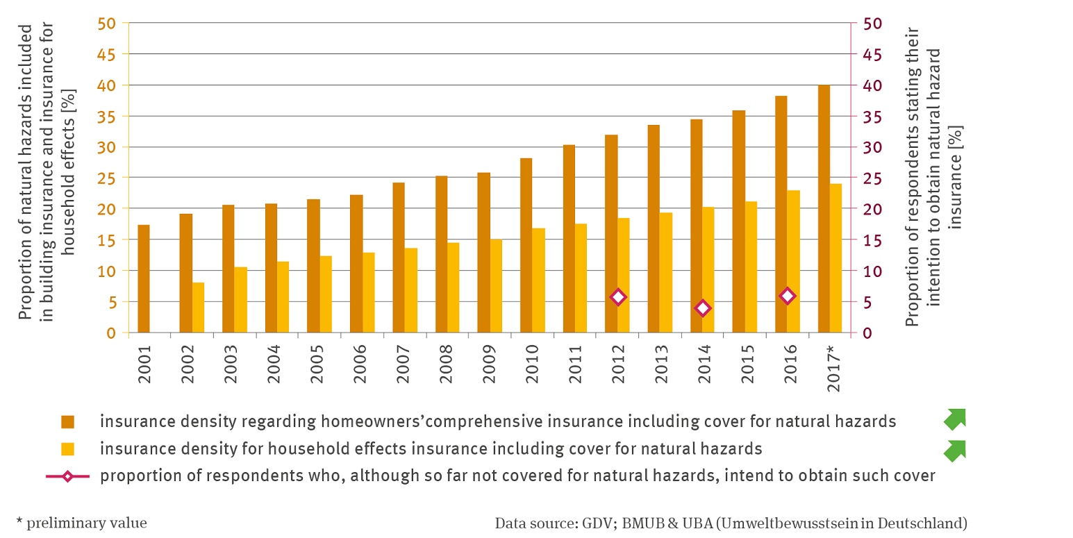 The bar chart shows the insurance density for homeowners insurance with natural hazard cover and the insurance density for household insurance with natural hazard cover. Both time series show a significant increasing trend from 2001, the household insurance from 2002 to 2017. In 2017, the insurance density for connected residential building insurance with natural hazard cover was 40 percent, and the insurance density for household insurance with natural hazard cover was 24 percent. Also shown in the graph for 2012, 2014 and 2016 are the percentages of respondents who do not yet have eEV but intend to take it out. The values for the three years are 5.8 percent, 4 percent and 6 percent.