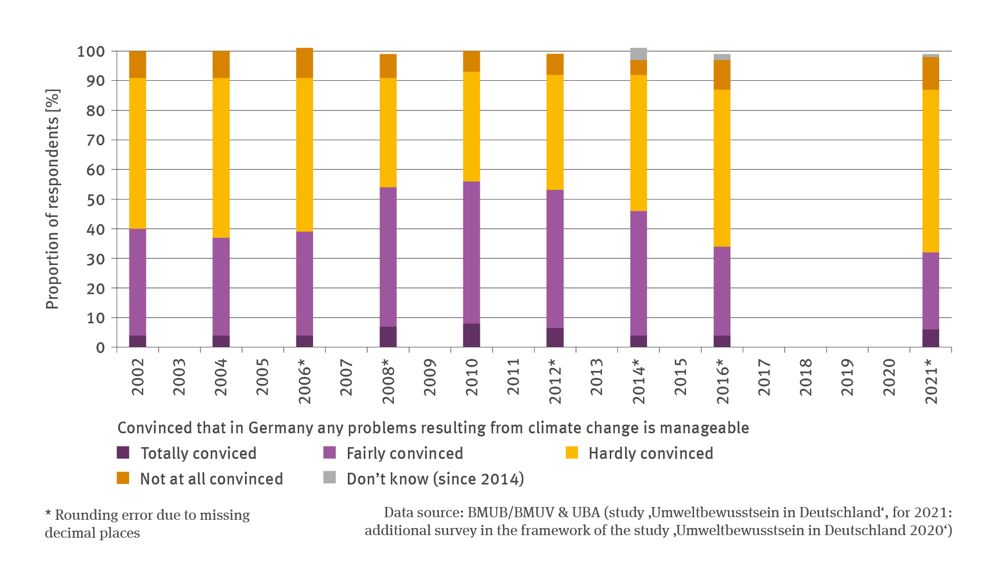 Since 2010 the proportion of citizens stating as a result of a representative public survey that the impacts of climate change are manageable in Germany has been declining. In 2021, 66 % of respondents were little or not at all convinced.