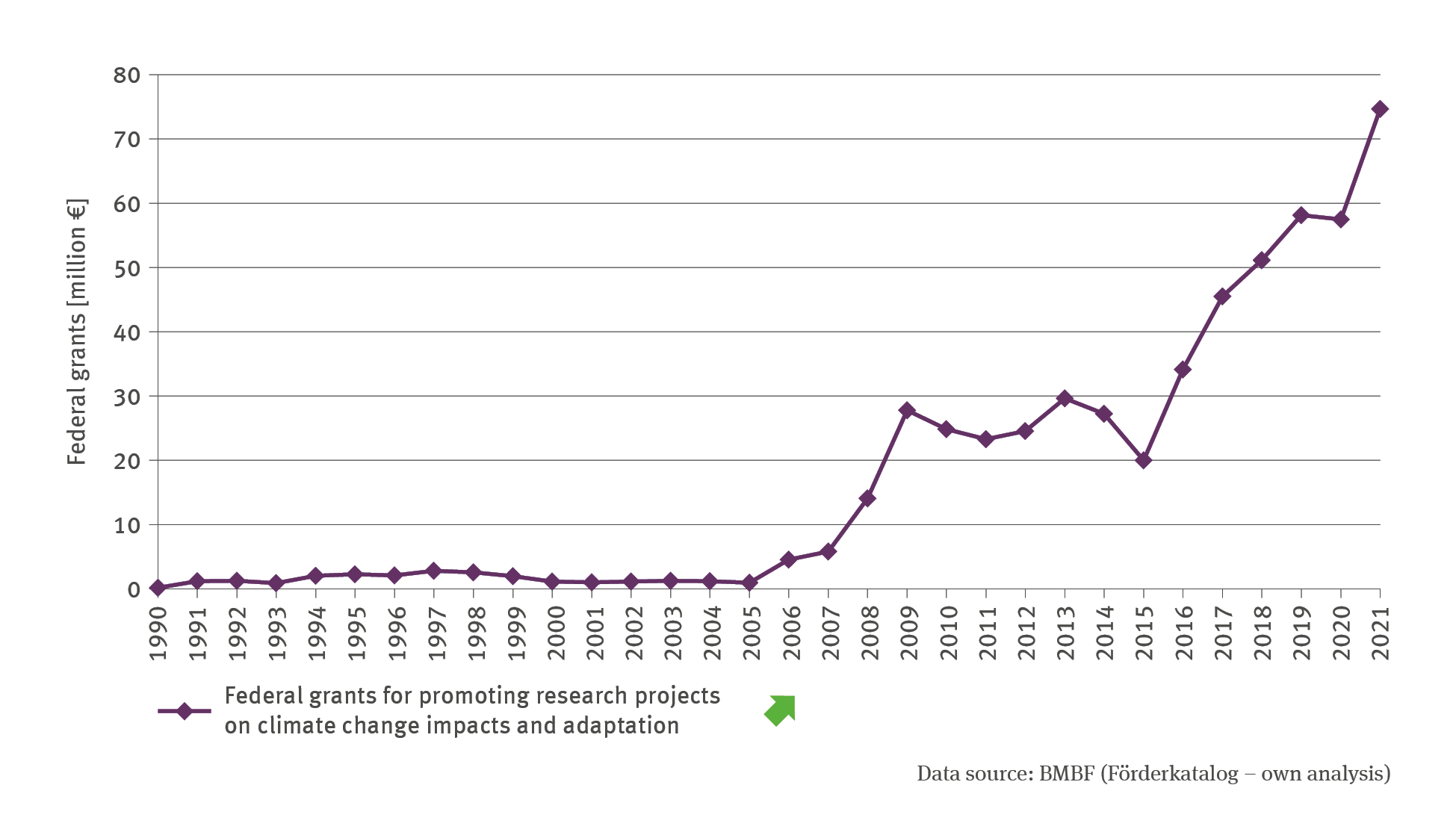To date there has been no cross-departmental compilation of all promotional activities relating to the adaptation to climate change; neither has there been an overview published of the funding disbursed for those purposes. Only the grants contributed by BMBF, BMUV and BMEL as well as the BMWK are listed centrally in the promotions catalogue published by BMBF; consequently, these are the only ones permitting an assessment in respect of the themes of climate change impacts and adaptation. From 2006 onwards, projects based on these focal points have been receiving grants at a major financial scale. In those days the BMBF created the promotional focal point ‘klimazwei – Research for Climate Protection and Protection from Climate Impacts’ endowed with a funding volume of some 35 million Euros to cover the period 2006–2009. Since then, the funds dispersed for grant-based funding of research and development on climate-change impacts and adaptation have been increasing considerably indicating a significant trend. The bulk of these funds went to measures provided by the BMBF, while smaller amounts relevant to these measures were awarded by the BMUV, BMWK and the other departments mentioned above.