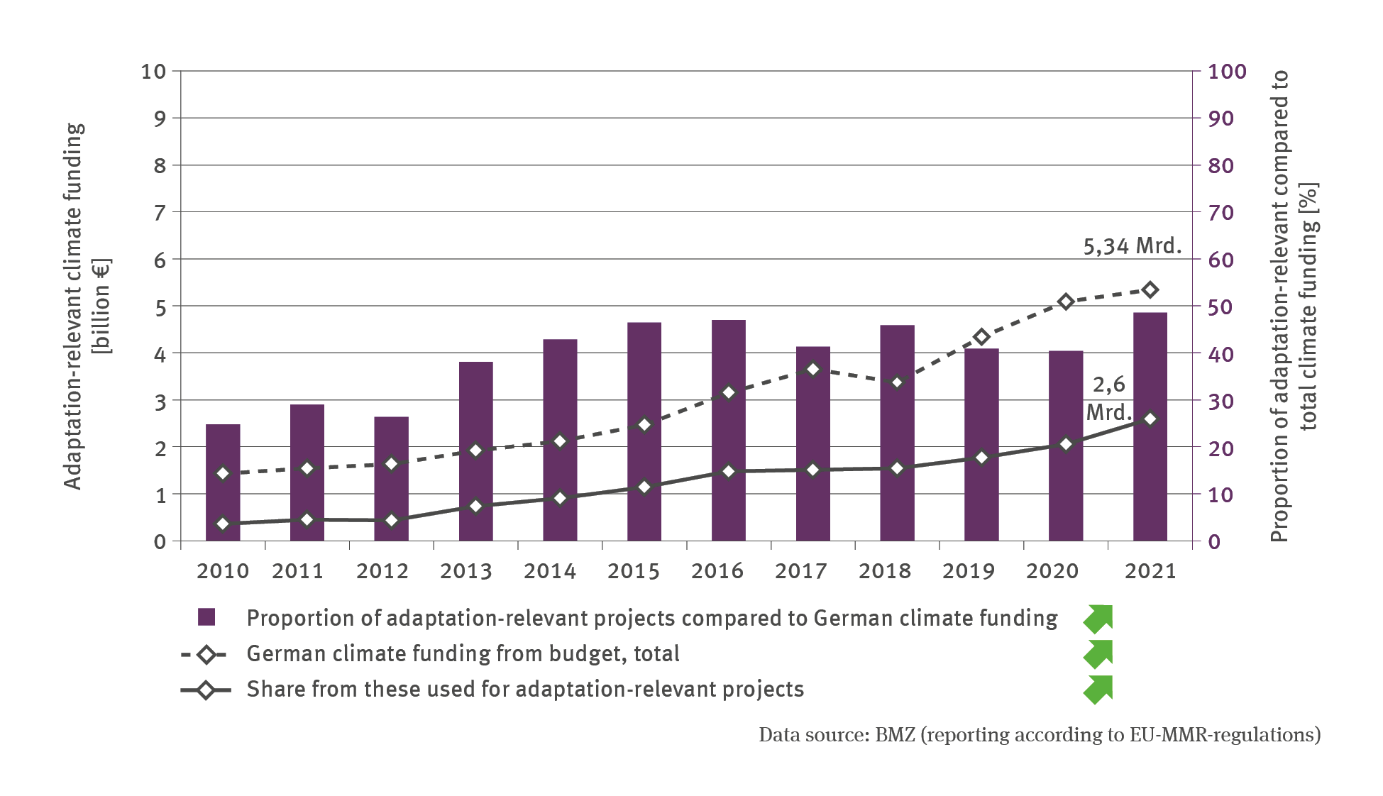 At the 2009 UN Climate Change Conference (COP) in Copenhagen the industrialised countries gave an undertaking to mobilise, from 2020 onwards, funds in the amount of USD 100 billion annually. At the COP 2015 in Paris this commitment was reviewed and the target year was extended to 2025. Within the framework of COP 26 in Glasgow in 2021 the industrialised states were requested to double their adaptation aid to developing countries in the run-up to 2025. A differentiation is made between financial contributions to multilateral programmes and bilateral development cooperation.