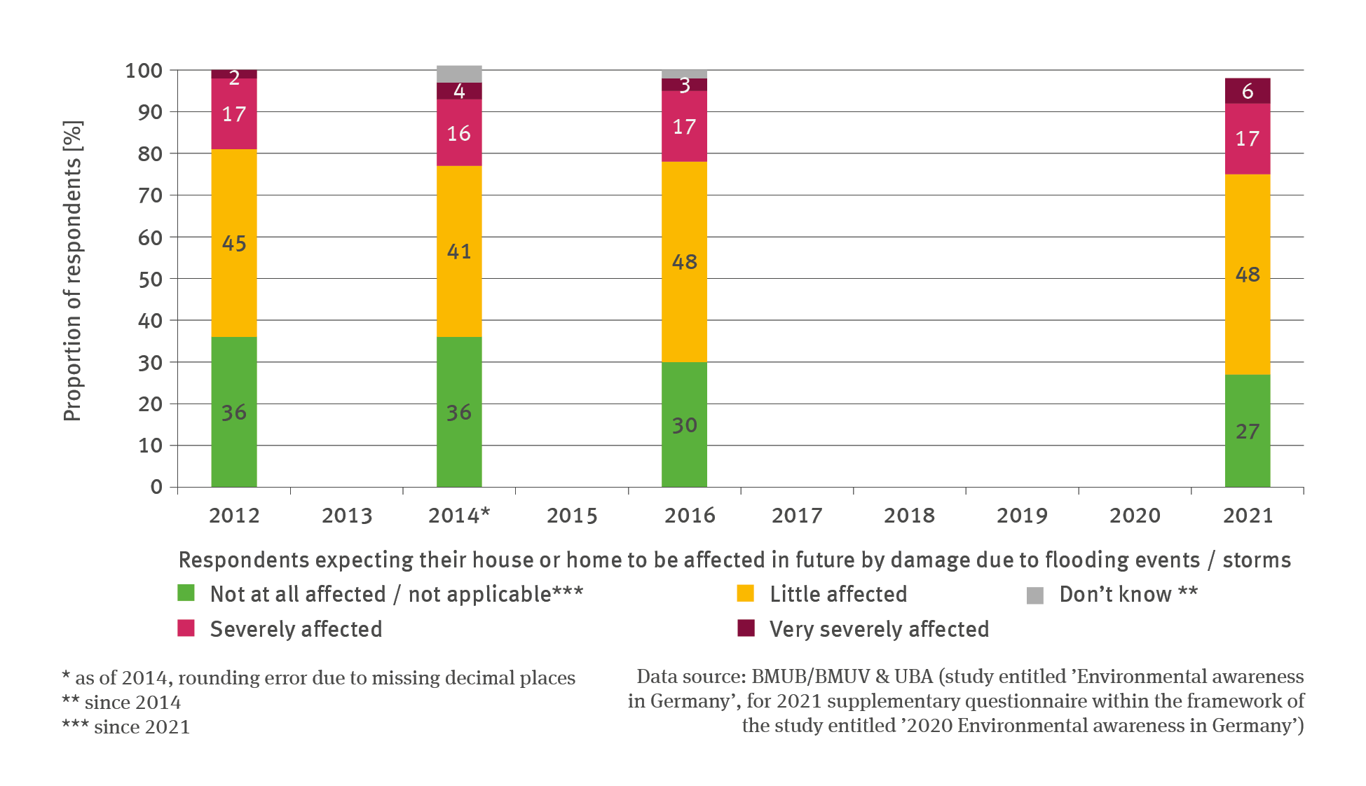 This is indicated by findings from the representative population survey entitled ‘Environmental awareness in Germany’ – and / or supplementary questions – which is carried out at regular intervals on behalf of the UBA and the Federal Environment Ministry215. The respondents are asked to estimate (among other statements), to what extent they might be personally affected by the impacts of climate change. In 2012, 81 % of respondents stated that they perceived little or no risk that floodwater events or storms might damage their house or home. In the subsequent survey this estimate had changed little: In 2014, 77 % and in 2016, 78 % perceived themselves little or not at all affected. The recent survey conducted in 2021 shows clearly that risk awareness has increased further. This is true, in particular, for the very distinct increase above all in the category of respondents who now feel very much affected. The survey was conducted in September 2021, in other words, two months after the disastrous flooding in the Ahr and Erft valleys. It is justified to assume that the respondents were still affected by those recent events. It is true to say, however, that the values recorded in the course of this survey permit only limited interpretations, as they are not linked to information on the actual exposure of respondents to the climate change impacts mentioned.