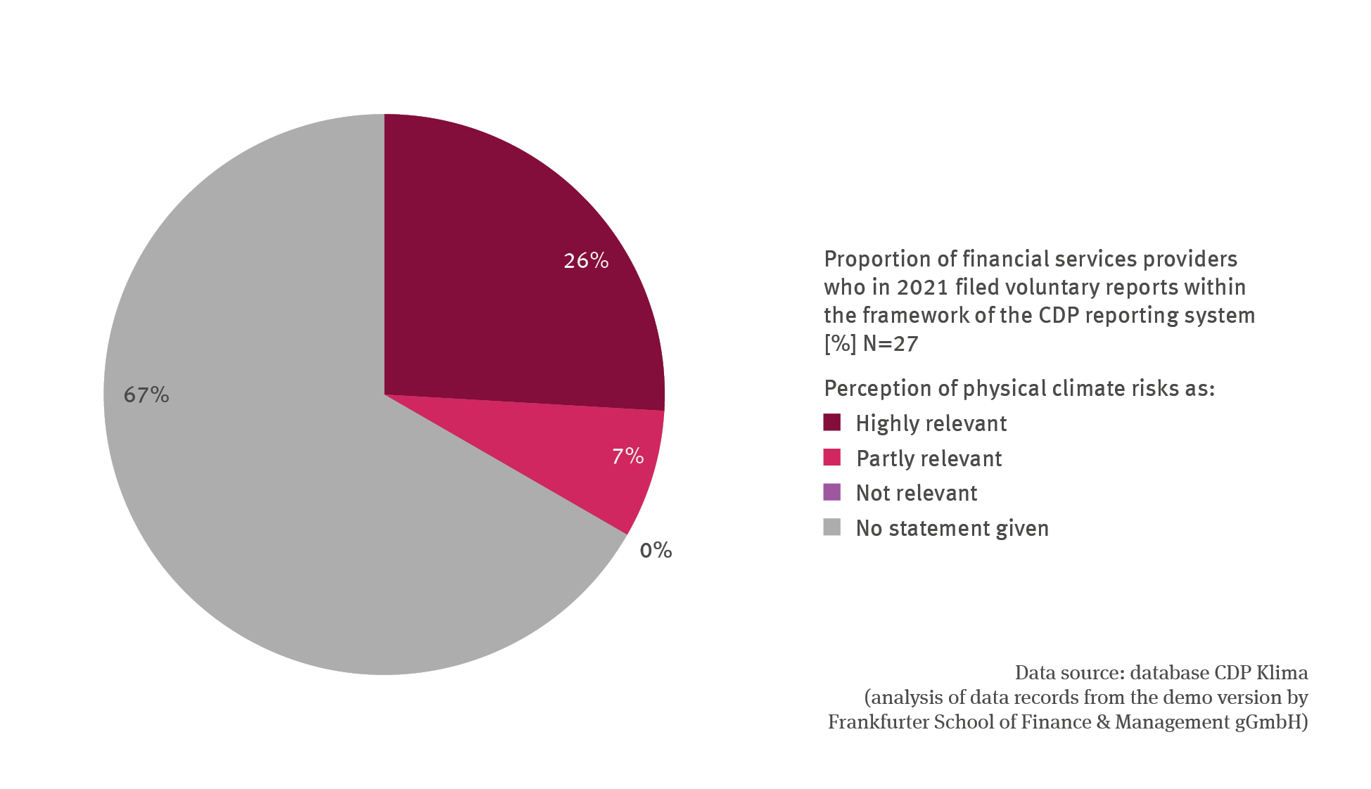 More than two thirds of the 27 financial services providers – filing reports in 2021 within the framework of CDP-Klima – did not submit a rating of the relevance of physical climate risks. The remaining companies rated these risks as relevant or even highly relevant – none of the companies denied the relevance of these risks directly. It is not unreasonable to assume that the high proportion of respondents who did not submit a relevance rating might be due to uncertainties in assessing these risks or that they failed to address these challenges.