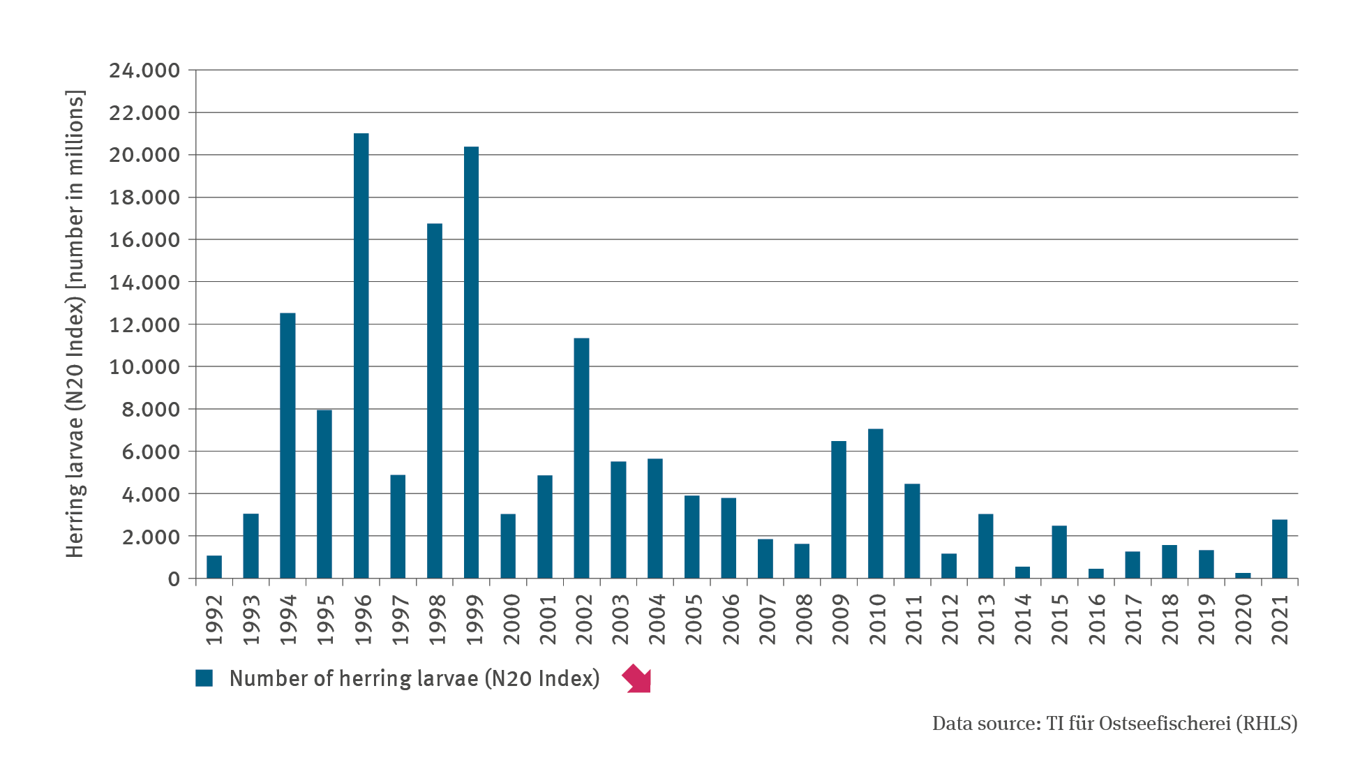 The indicator used for herring recruitment success in the western part of the Baltic Sea is the ‘N20 Index’. This index is based on the findings of the Rügen Herring Larvae-Survey (RHLS), which has been conducted by the Thünen-Institute for Baltic Sea Fisheries since 1992, in order to identify the abundance of herring larvae stocks in the Greifswalder Bodden area. In fact, this index represents the modelled total of herring larvae which, by the end of the spawning stage, have reached a body length of 20 mm. Among other things, the index provides an important basis for recommendations submitted by the International Council for the Exploration of the Sea (ICES) regarding fishing quotas for herring in the western part of the Baltic Sea.