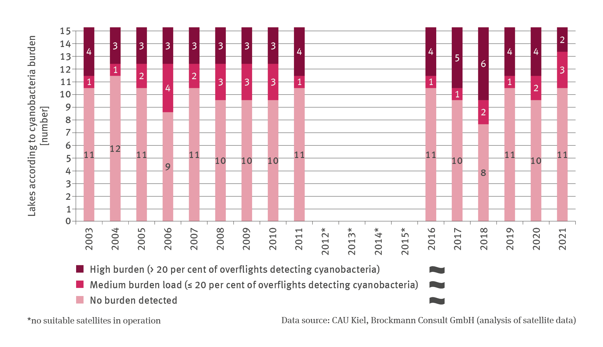 For the years from 2003 to 2011 and from 2016 onwards, suitable satellites were available. In the years between, there were no satellites active that were equipped with the requisite satellite sensors. The indicator is underpinned by data covering four lakes in the area of the Alps and associated foothills, three lakes in the central uplands region and eight lakes in the North German Plain. Lake Constance was covered in two ways (upper part and lower part). Work is ongoing to expand the selection of lakes. The overflights during the relevant months between July and September were assessed in respect of the occurrence of cyanobacteria. As a requirement for such occurrences, it was stipulated that positive cyanomarkers (phycocyanin) are found in at least 30 % of correctly captured pixels (grid cells). If in a maximum of 20 % of all valid overflights occurrences of cyanobacteria are recorded, this is taken as a medium burden; if the value exceeds 20 % of all valid overflights, that is taken as a high burden for the year in question.