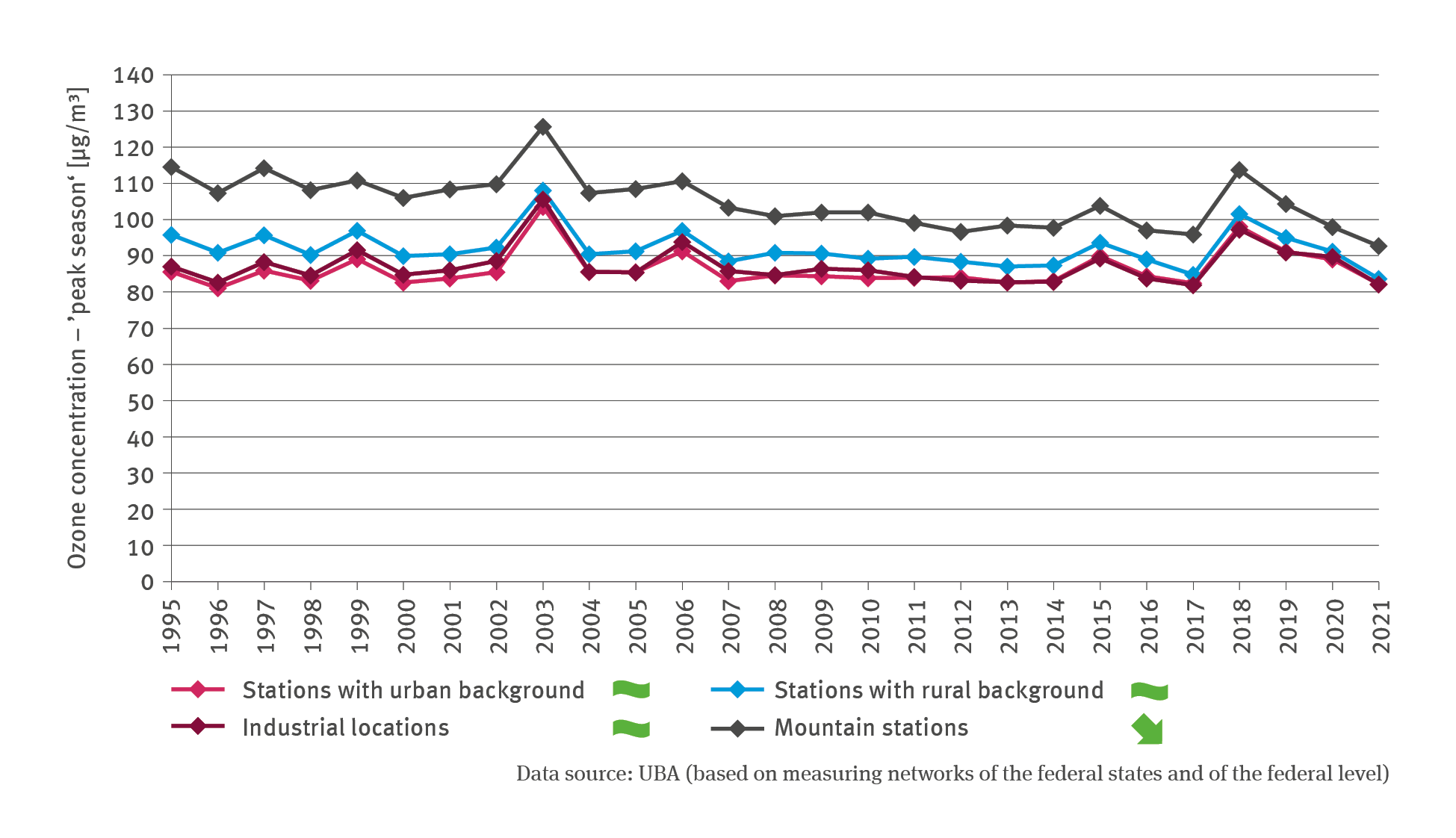 Ozone forms from nitrogen dioxide and volatile organic compounds at high temperature and sun irradiation. The emissions from those substances decreased distinctly since 1995; this led to a decline in peak concentrations of ozone. How­ever, at the same time, there was less ozone depletion caused by nitrogen monoxide, thus largely leading to ozone concentrations stagnating during the peak season. In 2003 and 2018, extreme weather conditions led to high ozone burdens.