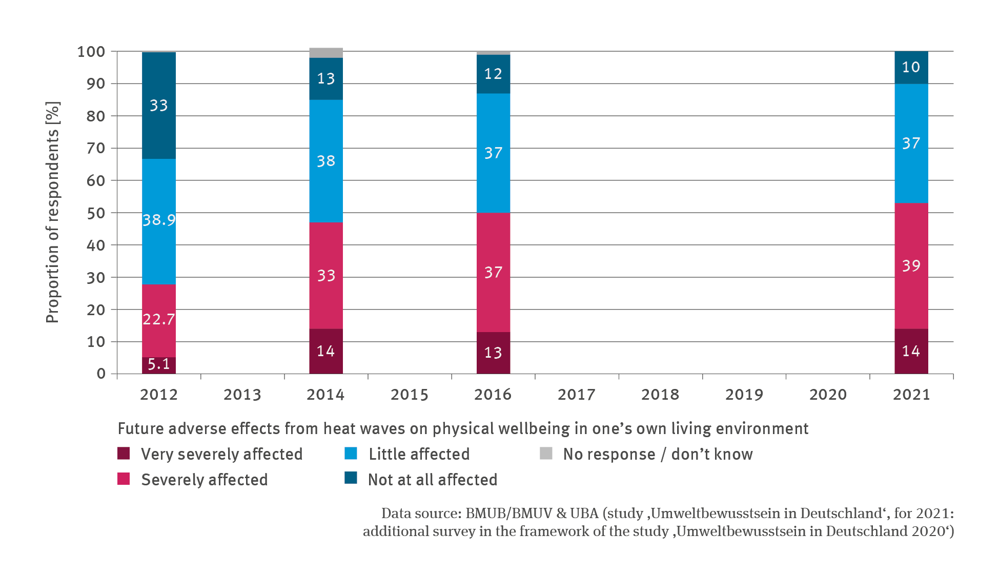 There has been an increase in the awareness of health hazards connected with great and persistent heat. In 2021 already 53 % of respondents stated that in terms of their own health, they expected to be affected in future either severely or very severely. Only every tenth respondent stated that they did not expect to be affected in future.