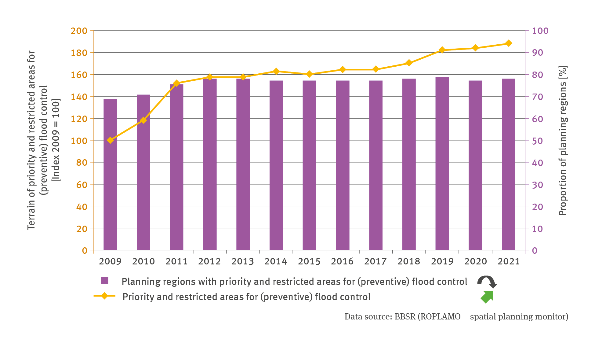 In the period of 2009 to 2021, the terrain of priority and restricted areas for (preventive) flood control underwent a distinct increase by approximately 6,300 square kilometres. By the end of 2021, 89 of 114 regions had incorporated relevant specifications in their regional plans.