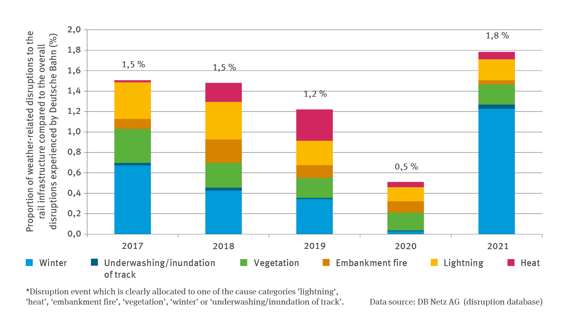 The indicator is based on data emanating from the disruption database maintained by the DB Netz AG. This shows the proportion of disruptions related to the weather and weather patterns in the company’s railway infrastructure covering all disruptions recorded by DB. In this context, disruptions are understood as events resulting in trains being late or cancelled. The disruption database serves for capturing disruption events occurring in the railway infrastructure as well as stating their primary cause. The disruptions are covered in the indicator according to one of six distinct cause categories: ‘lightning’, ‘heat’, ‘embankment fire’, ‘vegetation’, ‘winter’ as well as ‘railway track underwashing’.