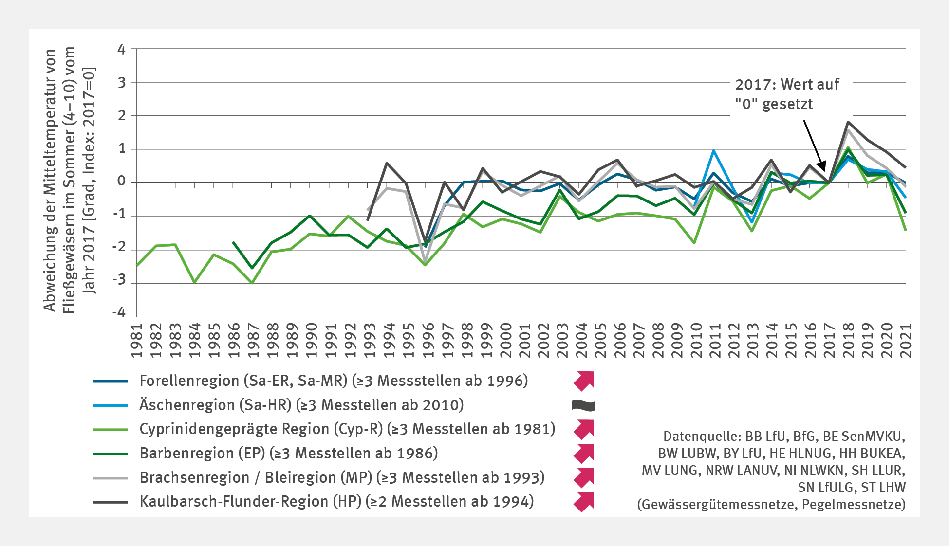 As in the case of indicators for the water level of lakes (cf. Indicator WW-I-7) and the water temperature of lakes (cf. Indicator WW-I-8) this indicator, too, is illustrated by means of indexed values. It makes no sense to calculate an absolute mean temperature value, as the individual gauging stations indicate different temperature levels, even within individual fish regions according to the specific local water morphology, natural environments and climatic conditions. In the process of indexing, a mean value is calculated for each measuring point, using the deviations from the index year 2017, for which the temperature value is set at ‘0’. The values of these deviations are used to calculate the mean value across all gauging stations and fish regions respectively. 2017 is the earliest year for which data are available from all the gauging stations considered.