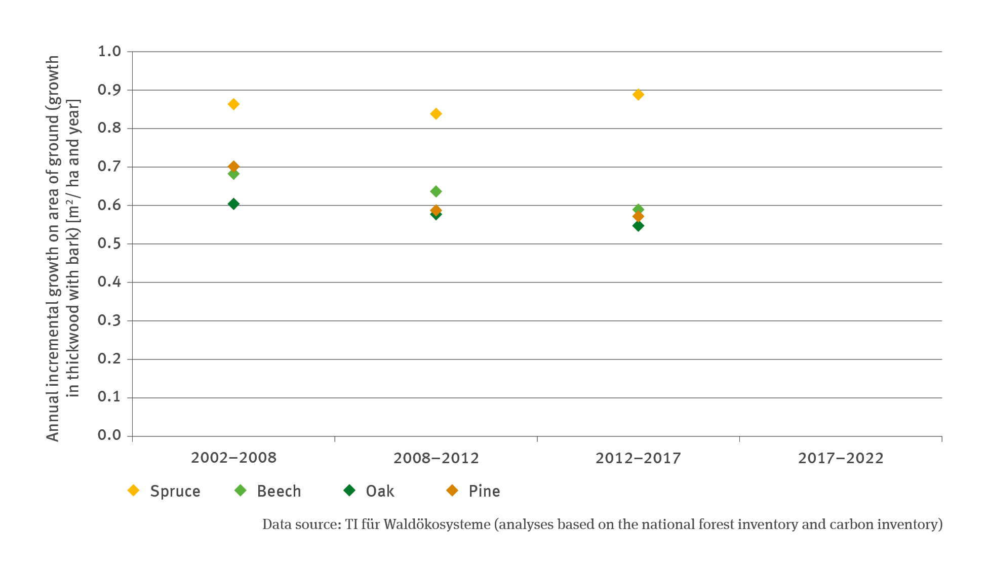 The outcomes of National Forest Inventories available so far are starting points for the establishment of a long-term time series pertaining to timber growth increments. From 2002 onwards, there are nationwide inventory data available. The data provide opportunities to draw inferences regarding the effects of extreme weather situations in a specific observation period. For example, it was no longer possible to find evidence, especially for spruce forests, in the old-established Länder for the period from 2002 until 2008 in the same volumes as the high average timber increments which were found in those areas until the end of the 20th century. It is assumed that, especially during the hot and dry years of 2003 and 2006, productivity losses will have occurred. However, it must be said that also in the subsequent period of 2008 to 2012 in which there were no drought years, the nationwide mean of timber increments for the four main tree species declined further, with pine trees most badly affected, followed by beech trees. One reason for this may be the increasing average age of all main tree species which would lead to decreasing timber increments.