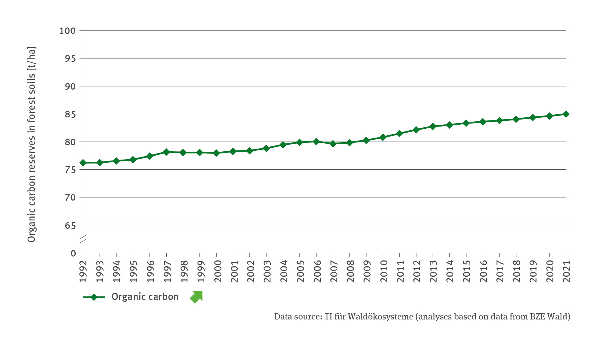 High contents of organic carbon in forest soils further the water storage capacity and improve the supply of nutrients. They also improve the trees’ chances of surviving hot periods with poor precipitation levels. Between 1992 and 2021 the humus reserves in Germany’s forest soils increased. However, this does not exclude the possibility of regional humus depletion.
