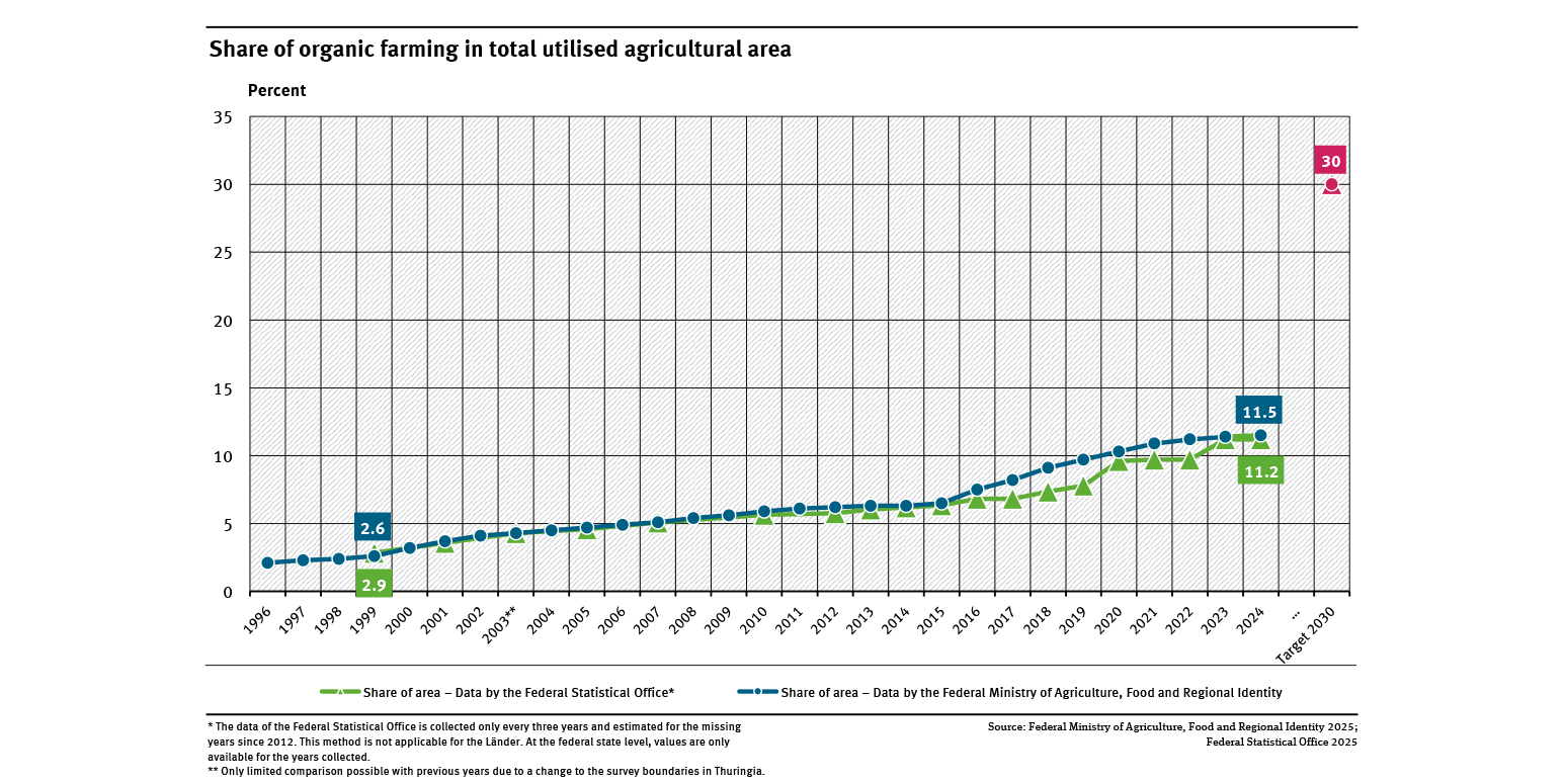 Die Daten zum ökologischen Landbau werden sowohl vom Statistischen Bundesamt als auch vom Bundesministerium, Landwirtschaft, Ernährung und Heimat (BMLEH) veröffentlicht. Zur Anwendung kommen zwei unterschiedliche Methoden. Für die Berichterstattung und Trendbewertung zur Nachhaltigkeitsstrategie werden die Daten des Statistischen Bundesamtes verwendet. Die Datenreihe des BMEL wird in der Nachhaltigkeitsstrategie jedoch ebenfalls gezeigt.