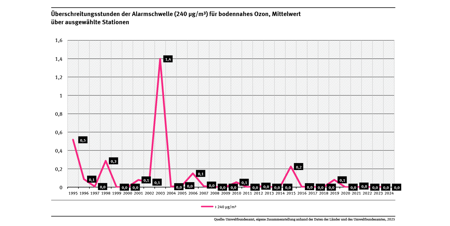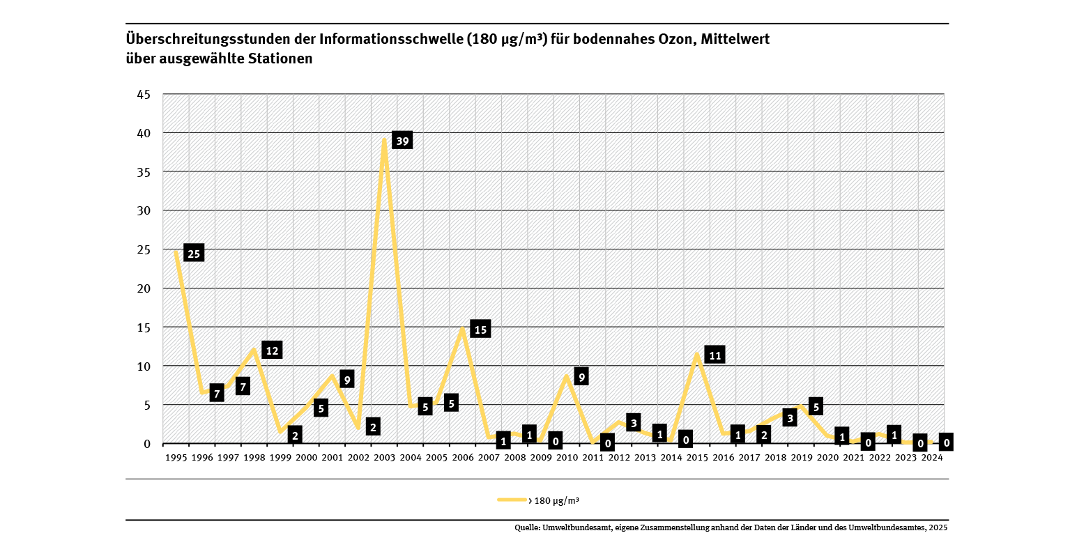 Seit 1995 hat die Zahl der Stunden mit Ozonwerten über 180 beziehungsweise 240 µg/m³ deutlich abgenommen (siehe Abb. „Überschreitungsstunden der Informationsschwelle (180 µg/m³) für bodennahes Ozon, Mittelwert über ausgewählte Stationen“ und Abb. „Überschreitungsstunden der Alarmschwelle (240 µg/m³) für bodennahes Ozon, Mittelwert über ausgewählte Stationen)“). Diese Abnahme ist von zwischenjährlichen Schwankungen überlagert, die auf die jährlich schwankenden meteorologischen sommerlichen Witterungsbedingungen zurückzuführen sind. Besonders deutlich ist dies im Jahr 2003 erkennbar. Im Sommer 2003 wurde eine außergewöhnlich langanhaltende Wettersituation beobachtet, welche die Ozonbildung begünstigte. Der Ozonsommer 2003 ist daher hinsichtlich der Spitzenwerte ein Sonderfall.