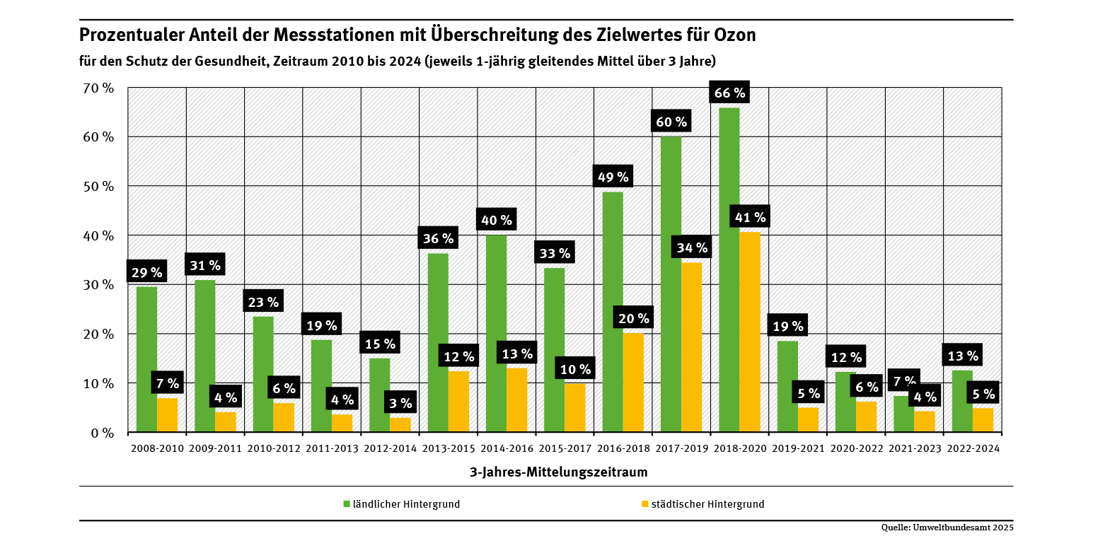 Seit 2010 gibt es zum Schutz der menschlichen Gesundheit für Ozon einen europaweit einheitlichen Zielwert: 120 Mikrogramm pro Kubikmeter (µg/m³) als 8-Stunden-Mittel sollen nicht öfter als 25-mal pro Kalenderjahr, gemittelt über drei Jahre, überschritten werden. Um die meteorologische Variabilität der einzelnen Jahre bei einer langfristigen Betrachtung zu berücksichtigen, wird über einen Zeitraum von drei Jahren gemittelt. Die meisten Überschreitungen werden an ländlichen Hintergrundstationen registriert, also entfernt von den Quellen der Vorläuferstoffe (siehe Abb. „Prozentualer Anteil der Messstationen mit Überschreitung des Zielwertes für Ozon“). Das liegt daran, dass Stickstoffmonoxid (NO), das in Autoabgasen enthalten ist, mit Ozon reagiert. Dabei wird Ozon abgebaut, so dass die Ozonbelastung in Innenstädten deutlich niedriger ist. Andererseits werden die Ozonvorläuferstoffe mit dem Wind aus den Städten heraus transportiert und tragen entfernt von deren eigentlichen Quellen zur Ozonbildung bei.