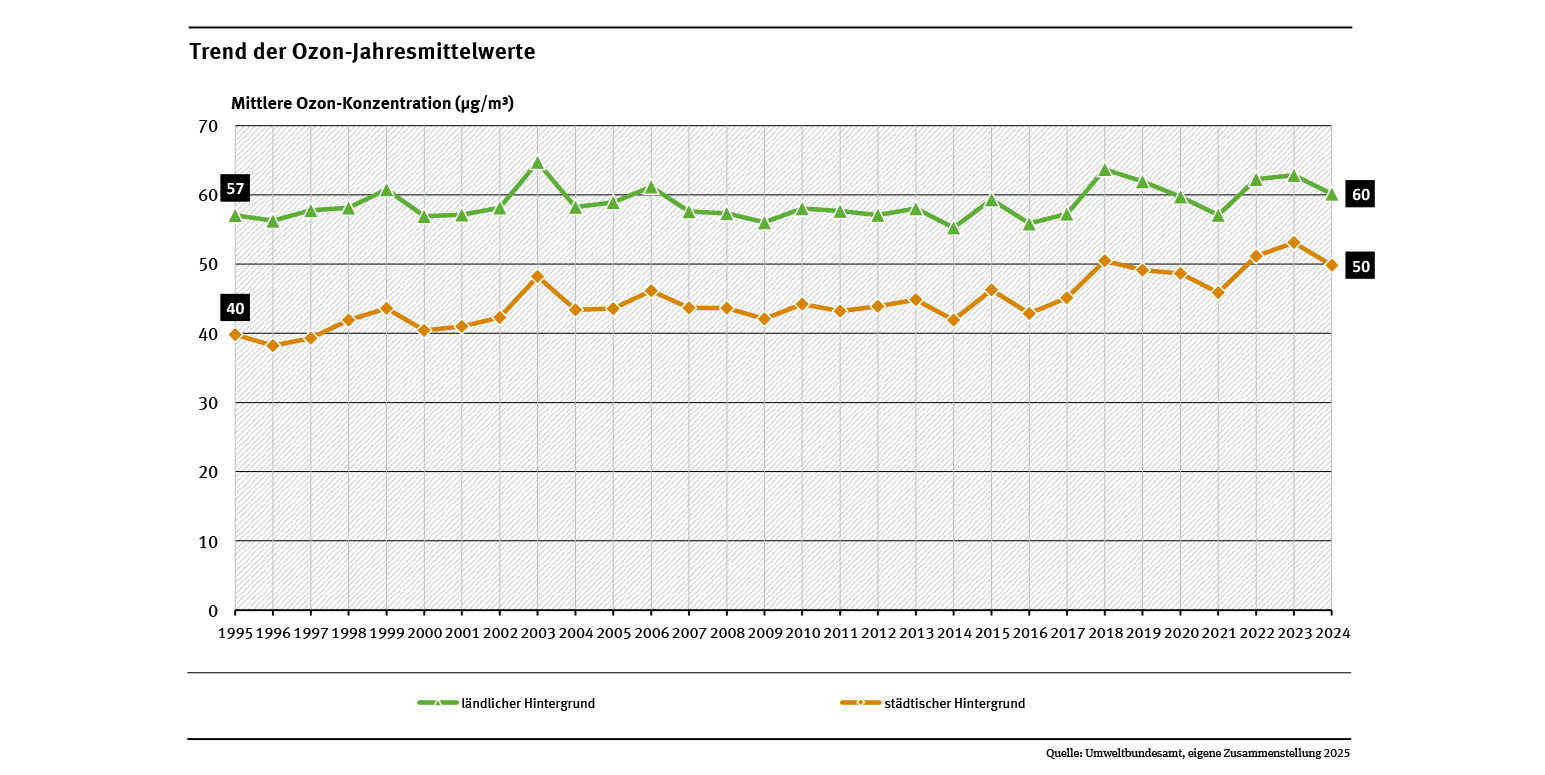 Die Jahresmittelwerte der Ozonkonzentration von 1995 bis 2024 zeigen an städtischen Stationen insgesamt einen zunehmenden Trend. Einerseits nahmen die Ozonspitzenwerte durch die Minderungsmaßnahmen für die NOx- und NMVOC-Emissionen in Deutschland deutlich ab, andererseits führte dies wegen der Verringerung des Titrationseffekts (Ozonabbau durch Stickstoffmonoxid) zu einem Anstieg der mittelhohen Ozonkonzentrationen, was schließlich bei den Jahresmittelwerten sichtbar wird (siehe Abb. „Trend der Ozon-Jahresmittelwerte“). Zudem wird von einer zunehmenden Bedeutung des interkontinentalen (hemisphärischen) Transports für die Ozonbelastung in Deutschland und Europa aufgrund der industriellen Emissionen in Asien und Nordamerika ausgegangen.