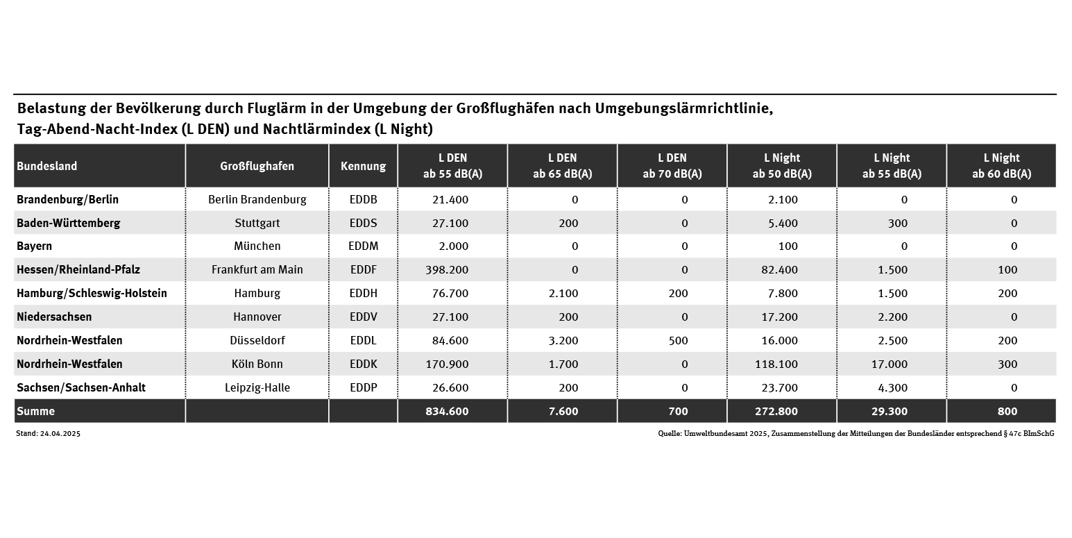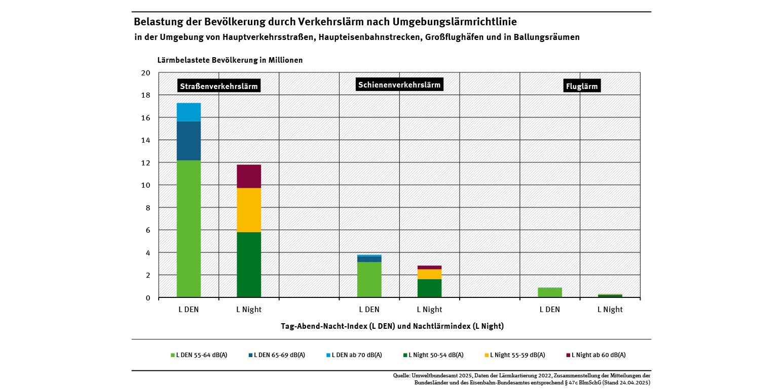 Die Ergebnisse zeigen, dass weite Teile der Bevölkerung von Lärm betroffen sind (siehe Abb. und Tab. zur Lärmbelastung der Bevölkerung). Allein an den betrachteten Straßen sind rund 17,3 Mio. Menschen von L DEN-Pegeln von über 55 Dezibel (dB(A)) betroffen. Bei solchen Pegeln können erhebliche Belästigungen und Störungen der Kommunikation auftreten.