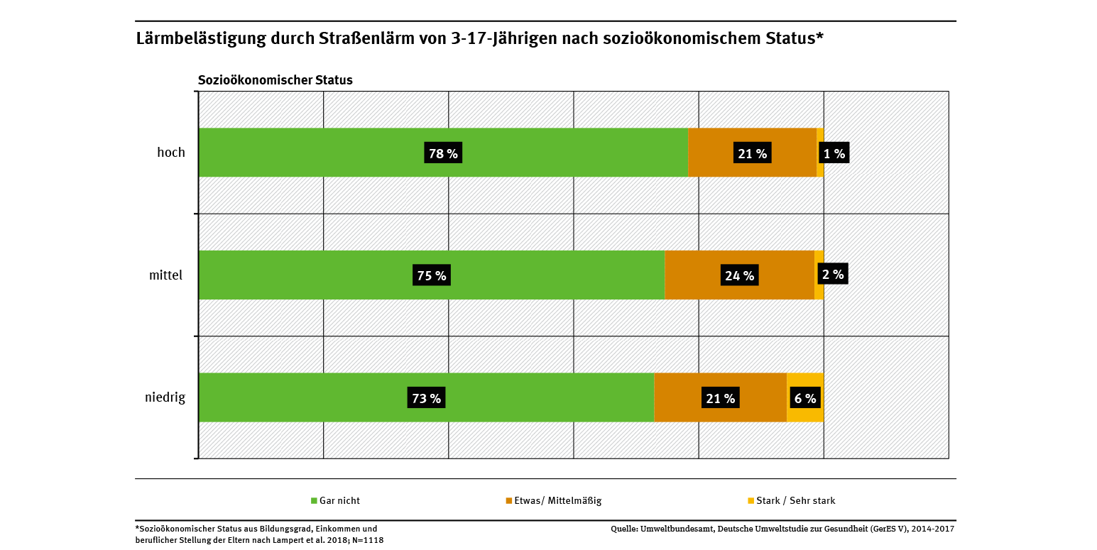 Nach den Ergebnissen der bundesweit repräsentativen Umweltbewusstseinsstudie von 2024 fühlten sich in Deutschland rund 31 % der Befragten durch Umweltprobleme gesundheitlich „sehr stark“ oder „stark“ belastet. Dabei nahmen Befragte mit niedrigem Einkommen subjektiv deutlich häufiger umweltbedingte Gesundheitsbelastungen wahr als Befragte mit hohem Einkommen. Das galt insbesondere für Hitzeperioden sowie Schadstoffe in Trinkwasser und Lebensmitteln (UBA 2025).