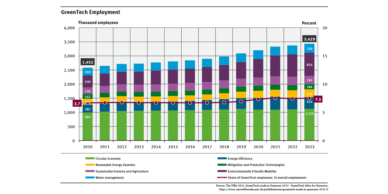 Die verschiedenen Facetten des Umweltschutzes sind für viele Berufe von Bedeutung und grüne Technologien und Produkte werden in den unterschiedlichsten Produktionsbereichen erstellt. Die Beschäftigungswirkungen von Umwelt- und Klimaschutz sowie Ressourcenschonung lassen sich daher nicht in einer amtlichen Statistik ablesen, sondern müssen separat errechnet werden. Die Beschäftigtenzahlen in der deutschen GreenTech Branche wurden zuletzt im Rahmen der Arbeiten für den GreenTech Atlas 2025 geschätzt. Die GreenTech Branche umfasst Unternehmen, die umwelt- und klimaschützende Technologien und Dienstleistungen anbieten. Zur GreenTech Branche werden dabei sieben Leitmärkte gezählt: Circular Economy, Energieeffizienz, erneuerbare Energiesysteme, Minderungs- und Schutztechnologien, nachhaltige Forst- und Landwirtschaft, umweltfreundliche Mobilität und Wasserwirtschaft.