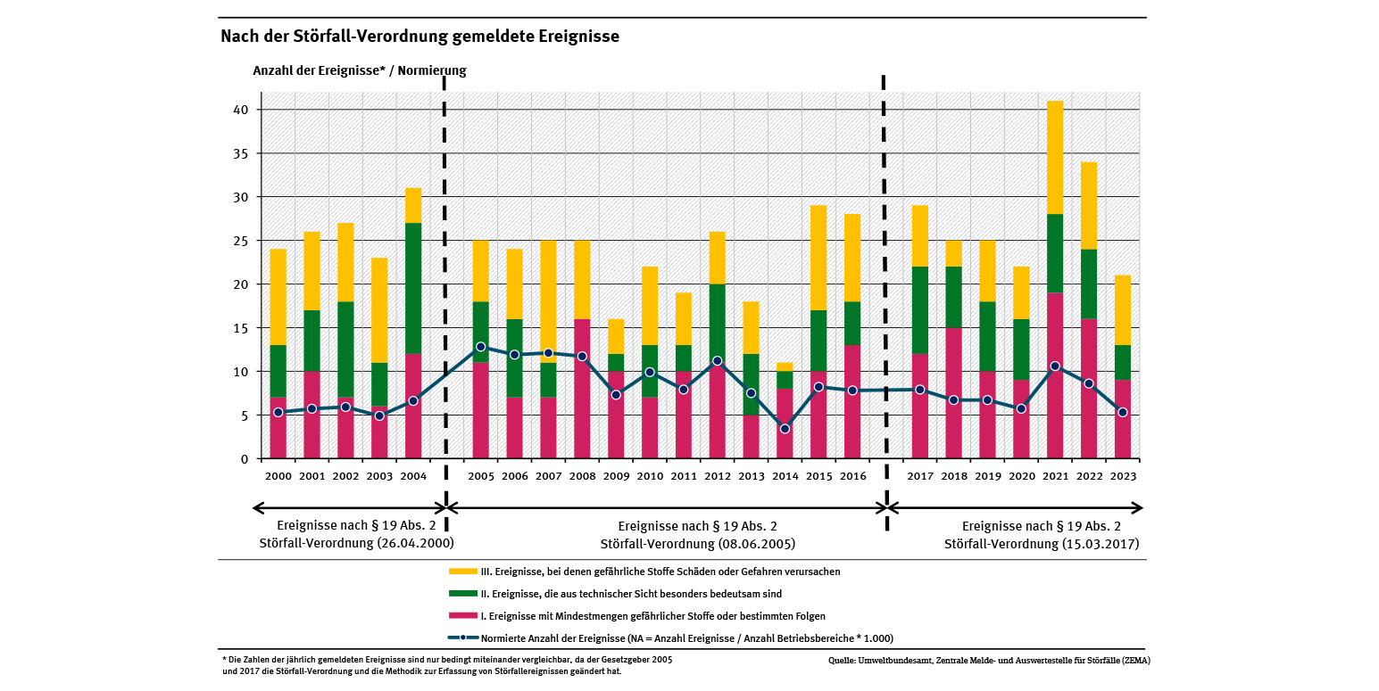 Diagramm: Unternehmen melden seit dem Jahr 2000 zwischen 11 und 41 meldepflichtige Ereignisse pro Jahr. Die auf die Anzahl der Betriebsbereiche normierte Anzahl der Ereignisse schwankt seit dem Jahr 2000 zwischen 5 und 13 Ereignissen pro 1.000 Betriebsbereiche. Für das Jahr 2023 liegt die normierte Anzahl der Ereignisse bei 5,3. Nach der Störfall-Verordnung gemeldete Ereignisse