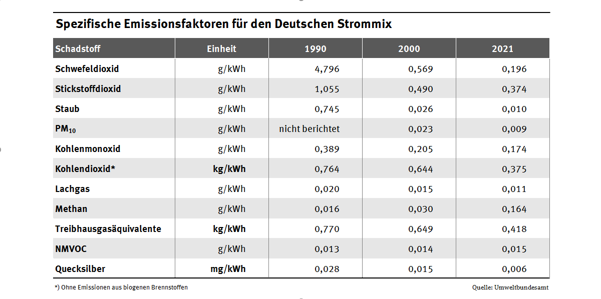 Die Tabelle zeigt exemplarisch für die Jahre 1990, 2000 und für das Jahr 2021 die Emissionen pro Kilowattstunde Strom (auch spezifische Emissionen genannt) des deutschen Strommixes für ausgewählte Schadstoffe. Diese Werte enthalten nur die direkten Emissionen der Stromerzeugung. Durch Vorketten, wie z.B. bei der Förderung der Brennstoffe, entstandene Emissionen werden in dieser Auswertung nicht berücksichtigt. Dies entspricht den internationalen Vorgaben für die Emissionsberichterstattung der Treibhausgase und der Luftschadstoffe.