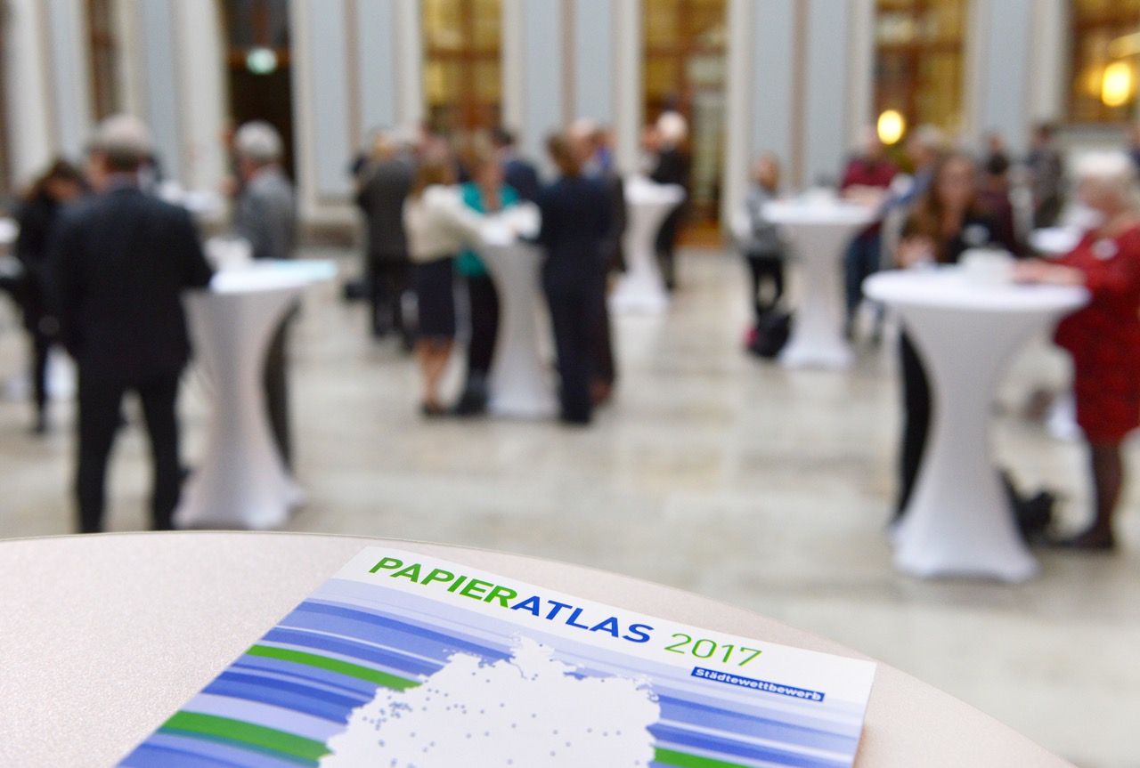 Seit zehn Jahren fördert der Papieratlas-Wettbewerb nachhaltiges Wirtschaften auf kommunaler Ebene. Städte und Gemeinden sollen motiviert werden, ihre Beschaffungspolitik auf Recyclingpapier umzustellen. Der Papieratlas 2017 belegt, dass die deutschen Großstädte inzwischen durchschnittlich 86 Prozent Recyclingpapier mit dem Blauen Engel verwenden.