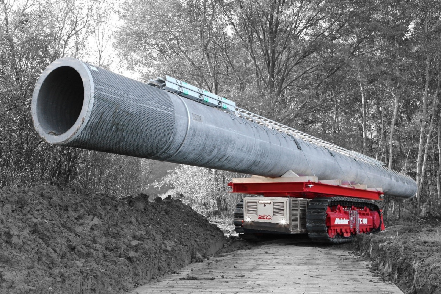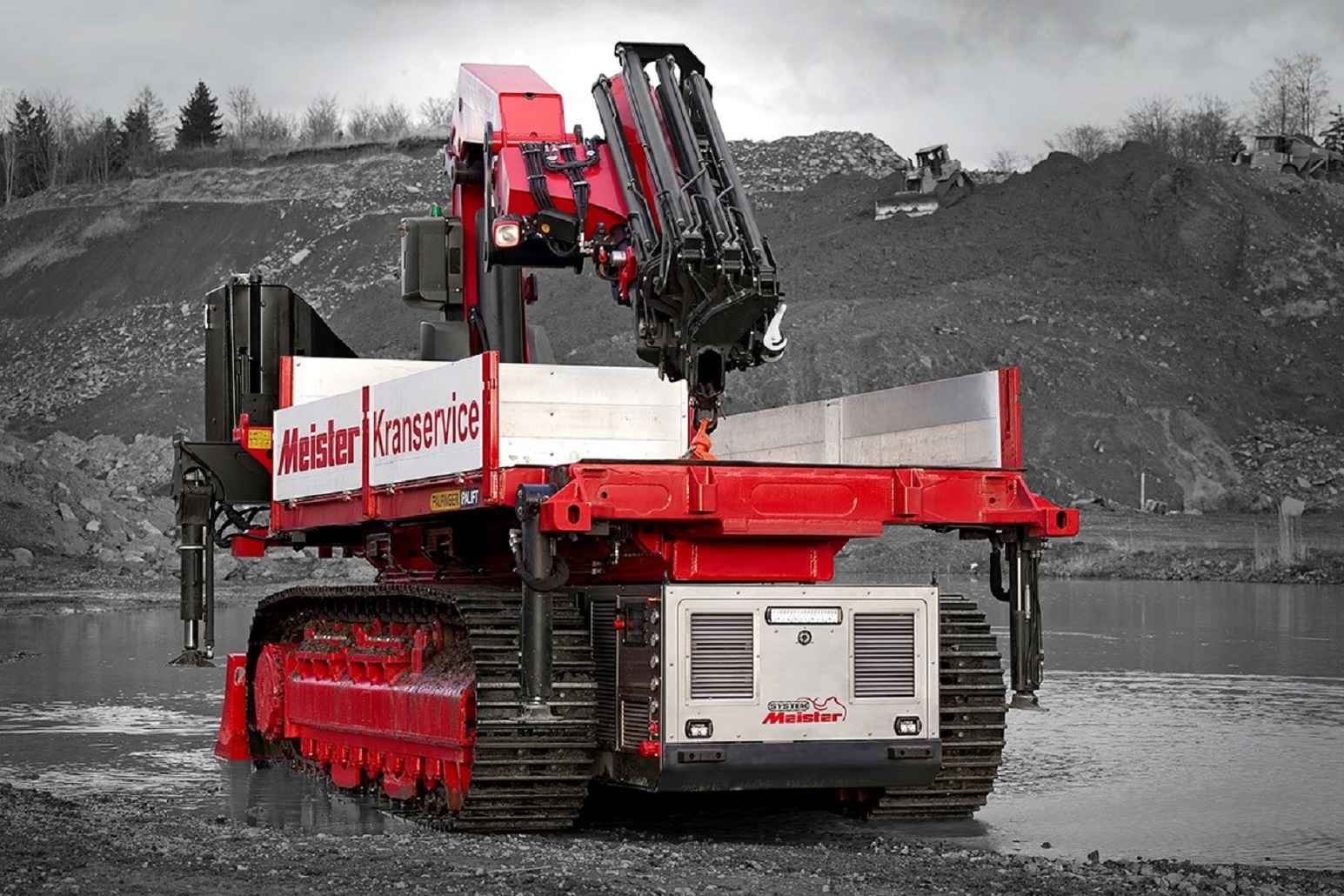 Das „System-Meister“-Raupenfahrzeug transportiert schwere, sperrige Bauteile, Kräne oder andere Baumaschinen auch im unwegsamen Gebirge und Wald. Da es im Vergleich zu großen Zugmaschinen engere Kurven fahren kann, sind weniger Baumfällungen und Geländeveränderungen nötig. Die Raupentechnik statt Räder verteilt das Gewicht auf eine größere Fläche und sorgt so für weniger Bodenverdichtung.