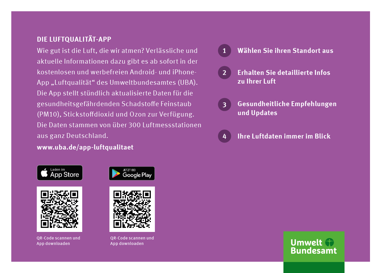 Wie gut ist die Luft, die wir atmen? Verlässliche und aktuelle Informationen dazu gibt es in der kostenlosen und werbefreien Android- und iPhone-App „Luftqualität“ des Umweltbundesamtes (UBA). Die App stellt stündlich aktualisierte Daten für die gesundheitsgefährdenden Schadstoffe Feinstaub (PM10 und PM2.5), Stickstoffdioxid, Ozon und Schwefeldioxid zur Verfügung.