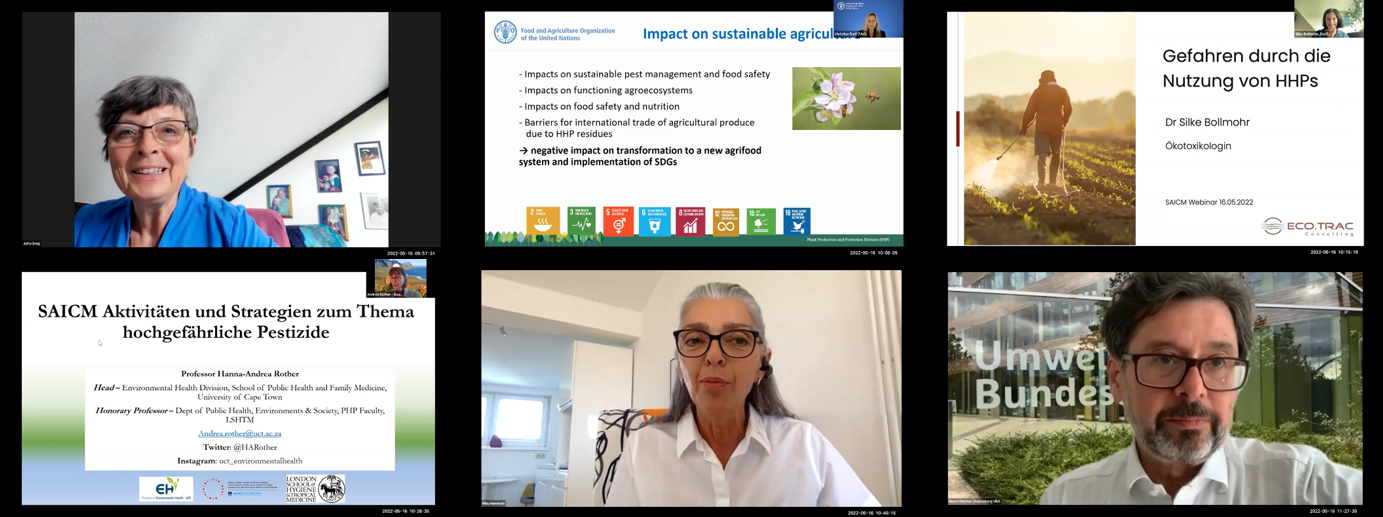 Prof. Dr. Hanna-Andrea Rother von der Abteilung Umwelt und Gesundheit der School of Public Health and Family Medicine der Universität Kapstadt (UCT), stellte unter SAICM laufende Aktivitäten und Strategien zu HHPs vor. HHPs werden unter SAICM als sog. Emerging Policy Issue (EPI) angesehen und in einer sog. Community of Practice (CoP) behandelt. Drei wesentliche Ziele werden dabei verfolgt: Diskussionen und multisektorales Engagement zu fördern, um Schlüsselthemen im Zusammenhang mit HHPs zu identifizieren; Beispiele bester Praxis im Umgang mit HHPs auszutauschen; und zu den Beratungen im IP beizutragen. Die inzwischen 326 Mitglieder der CoP repräsentieren diverse Stakeholder und Sektoren aus unterschiedlichen Regionen und weitere Mitglieder sind jederzeit willkommen.
