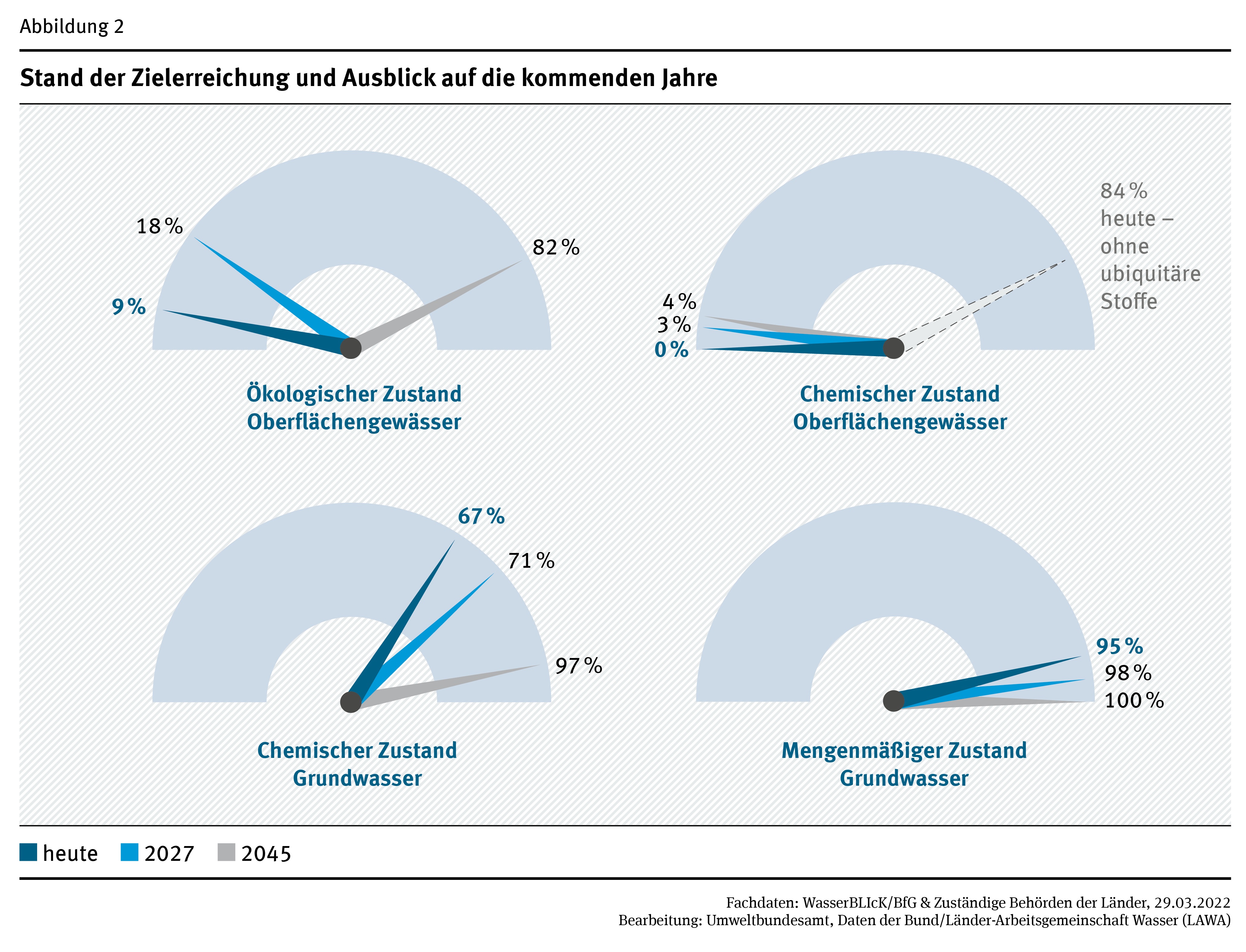 Heute weist kein Oberflächengewässer in Deutschland einen guten chemischen Zustand auf. Das ist vorrangig damit begründet, dass sich Quecksilber über die Verbrennung fossiler Brennstoffe über die Luft ausbreitet und sich flächendeckend in Boden und Wasser ablagert. Auch andere Schadstoffe sind Grund für diese Zielverfehlung.
