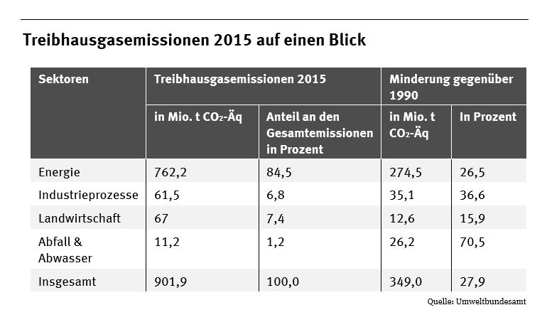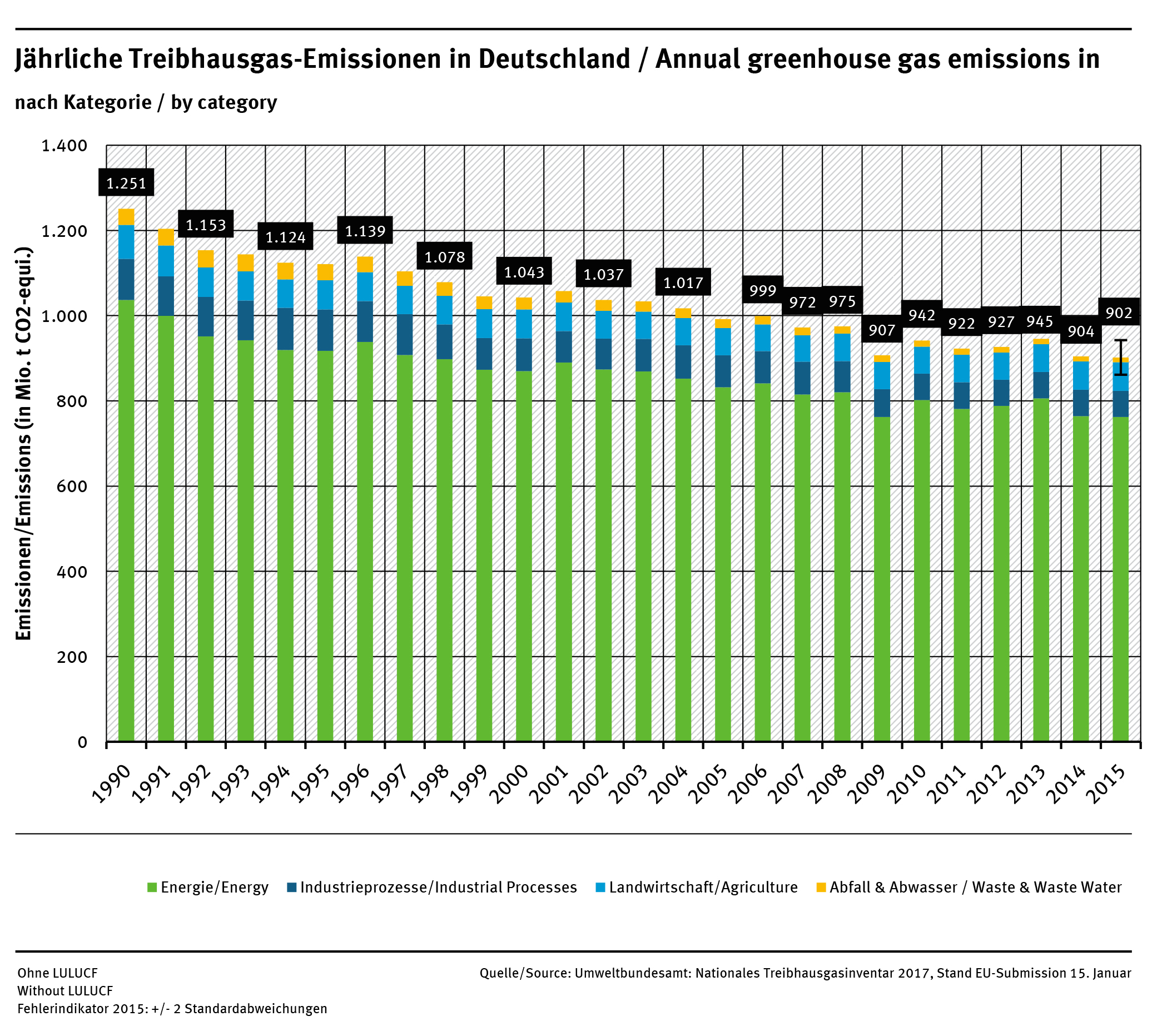 Germany recorded total emissions of 901.9 million tonnes of CO2 equivalents for 2015, which is 2.3 million tonnes (0.3%) less than in 2014 and 27.9% less than in 1990. This data is based on calculations which the German Environment Agency (UBA) has reported to the European Commission. The greatest reductions were achieved in the energy industries (11.8 million tonnes). UBA’s President Maria Krautzberger said: “The transformation of the energy system is showing signs of working. More and more electricity is based on solar-, wind- or hydropower and less on coal or oil. The steady decline in emissions is proof, but we have to stay on task. It will take a gradual and complete phase-out of the production of electricity from coal to protect our climate and to achieve the goals of the Paris Agreement.”