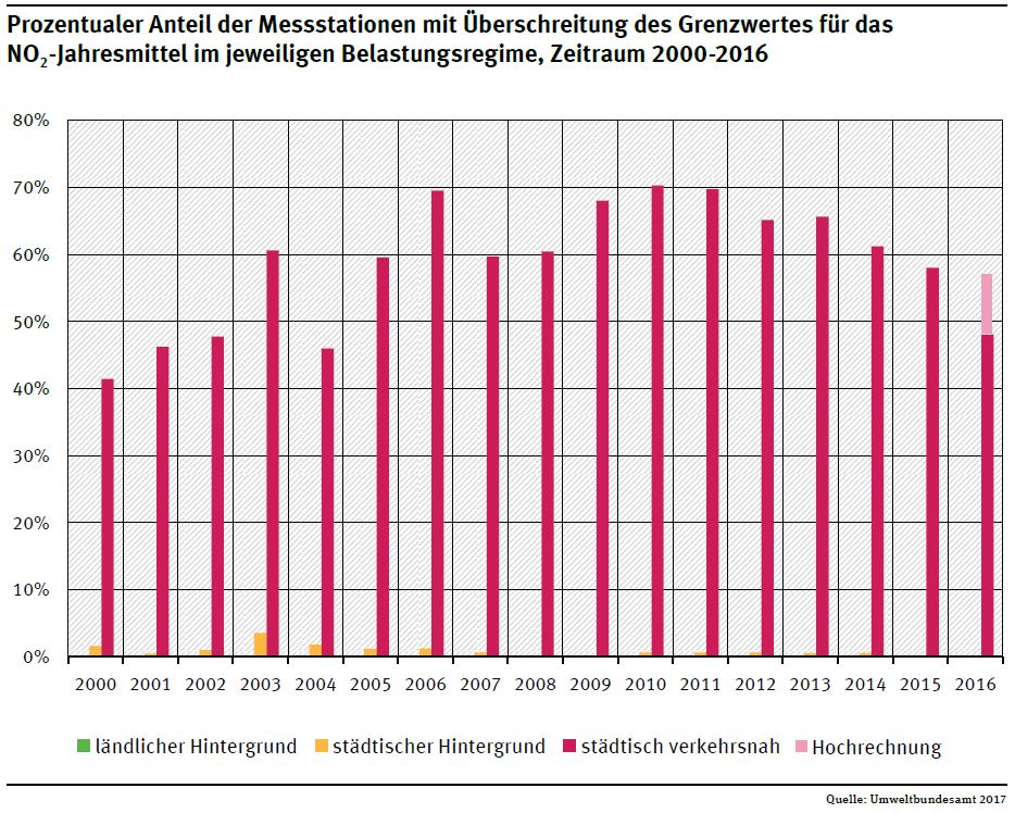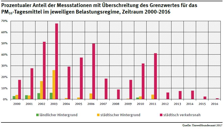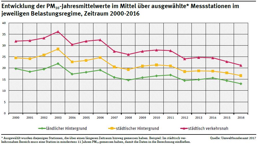 The air in Germany’s cities continued to have excessive levels of nitrogen dioxide pollution in 2016. This is according to an evaluation of preliminary measurements made by the federal states and the German Environment Agency (UBA). The threshold value of 40 micrograms per cubic metre (µg/m³) on a yearly average was exceeded at about 57 per cent of all the measuring stations located near major thoroughfares. There has been only a slight decline in this trend since 2010. In contrast, there has been good progress made in particulate pollution: 2016 is the year with the lowest levels since 2000. Ozone concentrations were also rather low compared to the last 20 years. However, the limits for ozone and particulates which are recommended by the World Health Organization (WHO) continue to be exceeded. The WHO levels are much more restrictive than the limit values which apply in the EU.