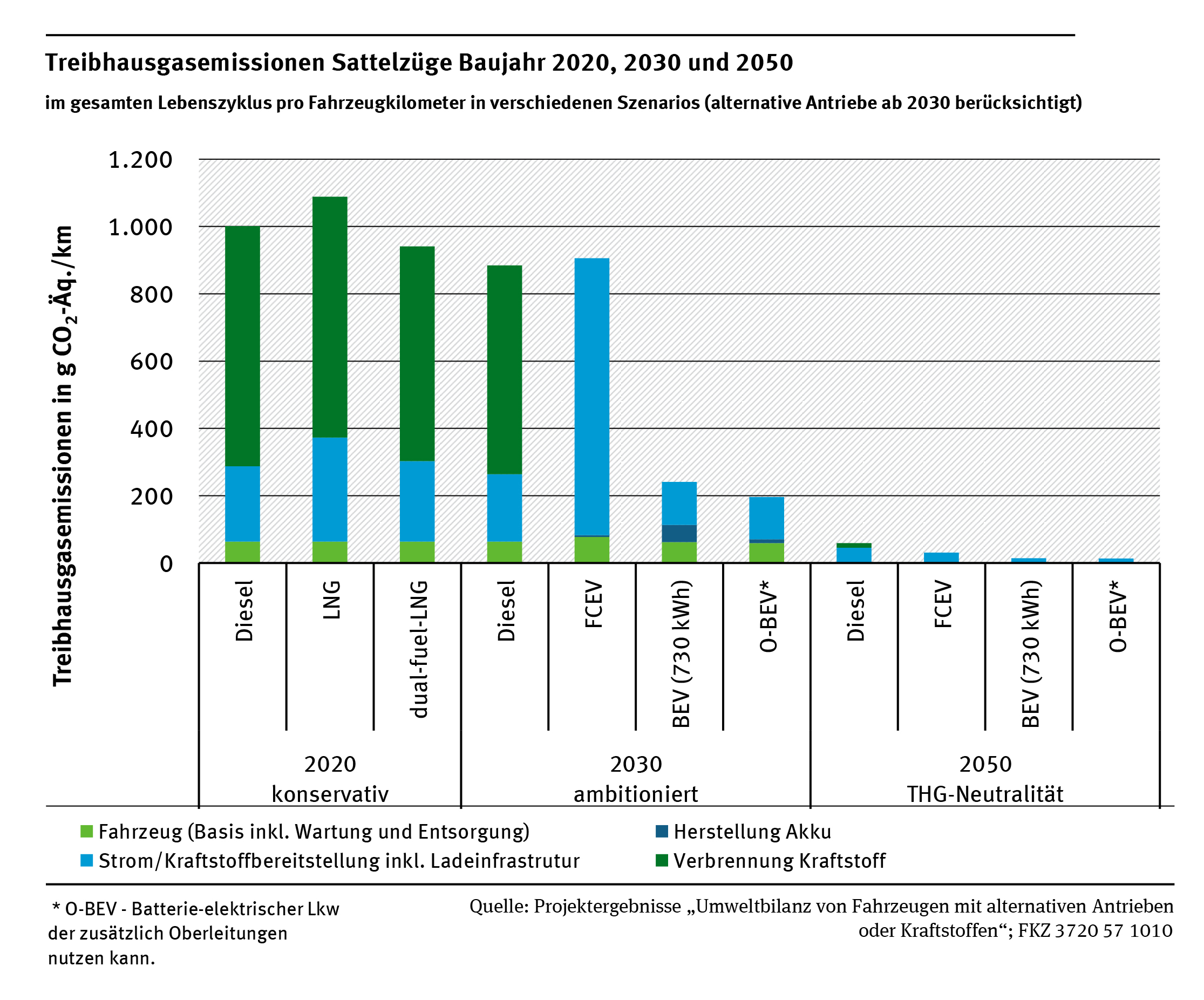The study "Analysing the environmental footprint of motor vehicles with alternative drive systems or fuels on the way to greenhouse gas-neutral transport" was commissioned by the German Environment Agency (UBA) and carried out by ifeu – Institute for Energy and Environmental Research Heidelberg. As well as greenhouse gases, the study also analysed energy, resource and water consumption and pollutant emissions to air, water and soil. In addition to the direct environmental impact of vehicle use, the environmental impact of the production of vehicles, fuels and power plants was also analysed in detail as a so-called “background system”. The analyses were carried out for vehicles registered in 2020, 2030 and 2050.