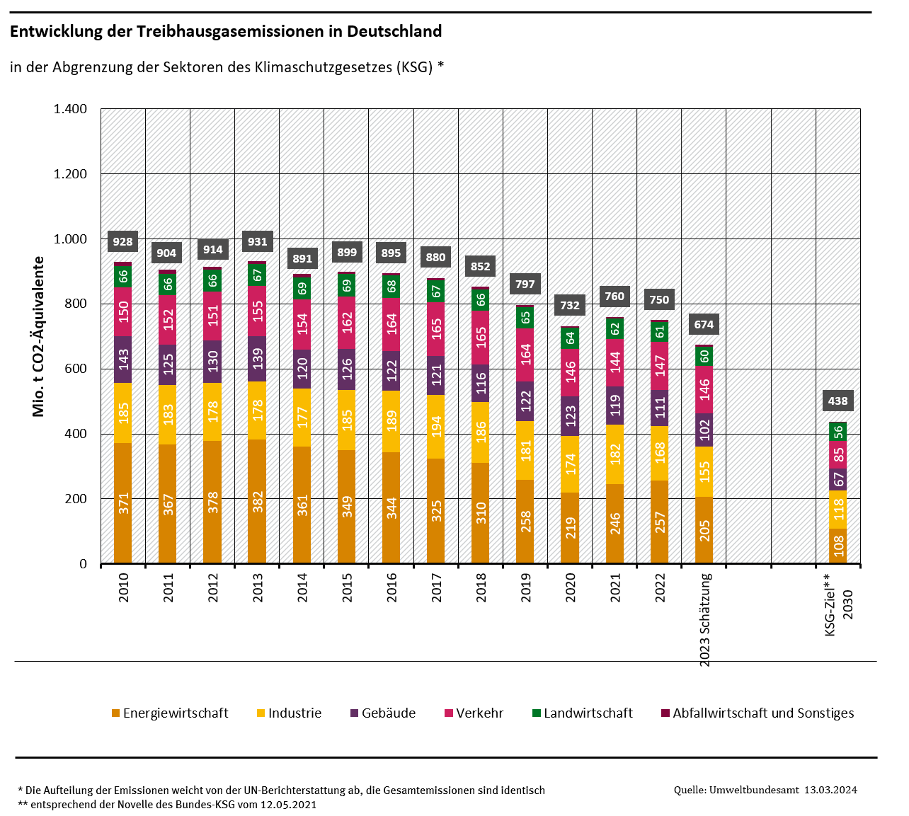 In 2023, greenhouse gas (GHG) emissions in Germany fell by 10.1 per cent compared to 2022. This is shown by new figures from the German Environment Agency (UBA). The reasons for this are the increased share of renewable energies, a decline in fossil fuel energy production and lower demand for energy from industry and consumers. In total, around 673 million tonnes of GHG were released in Germany in 2023 – 76 million tonnes or 10.1 percent less than in 2022. This is the sharpest decline since 1990. However, the transport sector in particular needs to take further action on climate protection. It is once again falling well short of its climate targets and is 13 million tonnes above the permitted sector budget.
