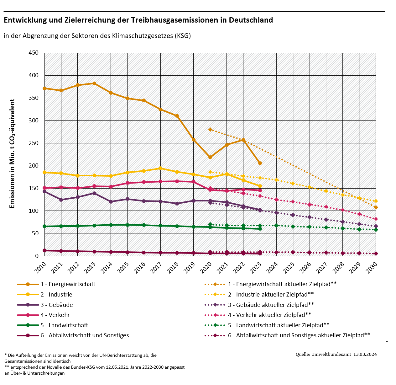 The available emissions data for 2023 represent the best possible calculation at present. They are associated with corresponding uncertainties, in particular due to the limited statistical basis for calculation available at this time. The calculations are derived from a system of model calculations and trend extrapolations of the detailed inventories of GHG emissions for 2022 published in January 2024. The complete, official and detailed inventory data on GHG emissions in Germany for 2023 will be published by the UBA in January 2025 with the submission to the European Commission.