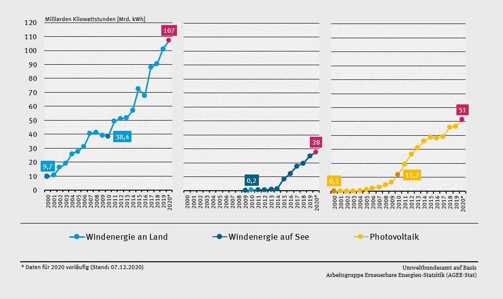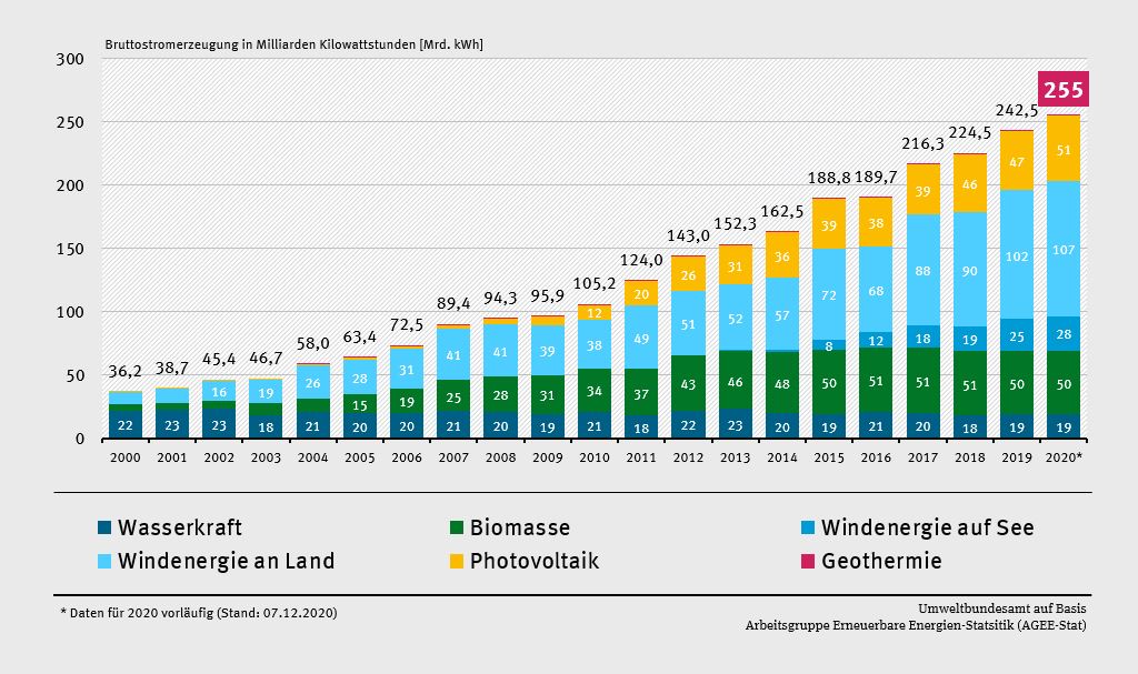 Based on available data, electricity generation from renewable energies can be expected to reach about 255 billion kilowatt hours (billion kWh) in 2020. This represents an increase of about five percent over the previous year (242 billion kWh). Since the Covid-19 pandemic also significantly reduced electricity consumption, the share of green electricity increased significantly from 42 per cent in 2019 to an estimated 46 per cent. The growth in renewable electricity generation can mainly be attributed to electricity generation from solar power installations (+10 per cent, up to 51 billion kWh) and wind power stations (+7 per cent, up to 135 billion kWh, of which 107 billion kWh is onshore and 28 billion kWh is offshore). In contrast, electricity generation from biomass remained about the same as 2019 (44 billion kWh) and electricity generation from hydropower (19 billion kWh) is estimated to have declined slightly (minus 5 per cent).