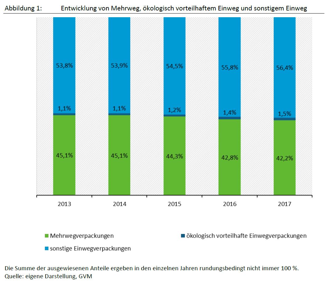 In 2017 only about 42 percent of all beverages was packaged in reusable bottles, landing the market share 0.5 percentage points lower than in 2016. New data is based on the latest survey by the German Environment Agency (UBA) of the beverage filling sector in Germany. The reusables share therefore continues to fall far short of the 70 percent target required by the Packaging Act. UBA President Maria Krautzberger said: "Short transport routes and reusable packaging are vital to avoid pollution and waste, and for that we need refillables systems that work well. Supermarkets and beverage sales points should offer as many beverages packaged in reusable bottles as possible and help in the effort to generate less waste." Most beverages are now bottled in disposable plastic bottles, a segment with a market share of about 52 percent. Cans have a market share of around 4 percent. Drinks carton packaging and stand-up bags have a market share of around 1.5 percent. One-way glass bottles have a share of well below one percent in the drinks segments subject to a deposit.