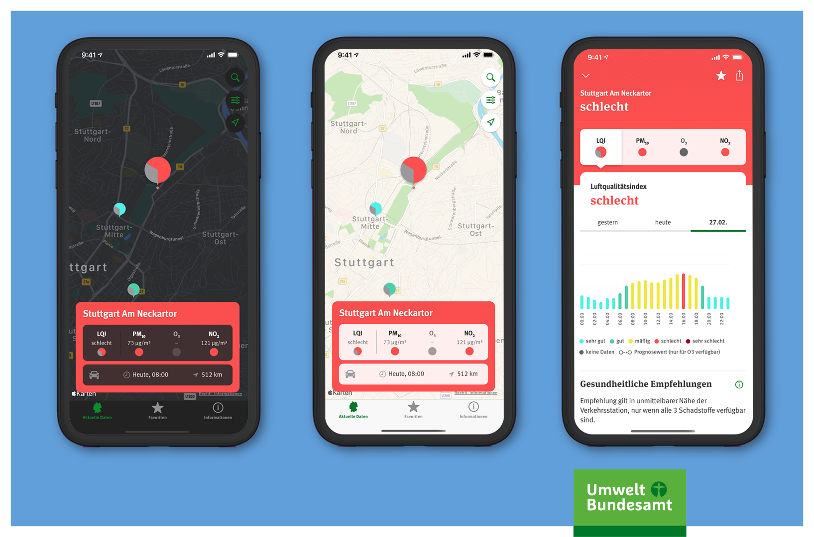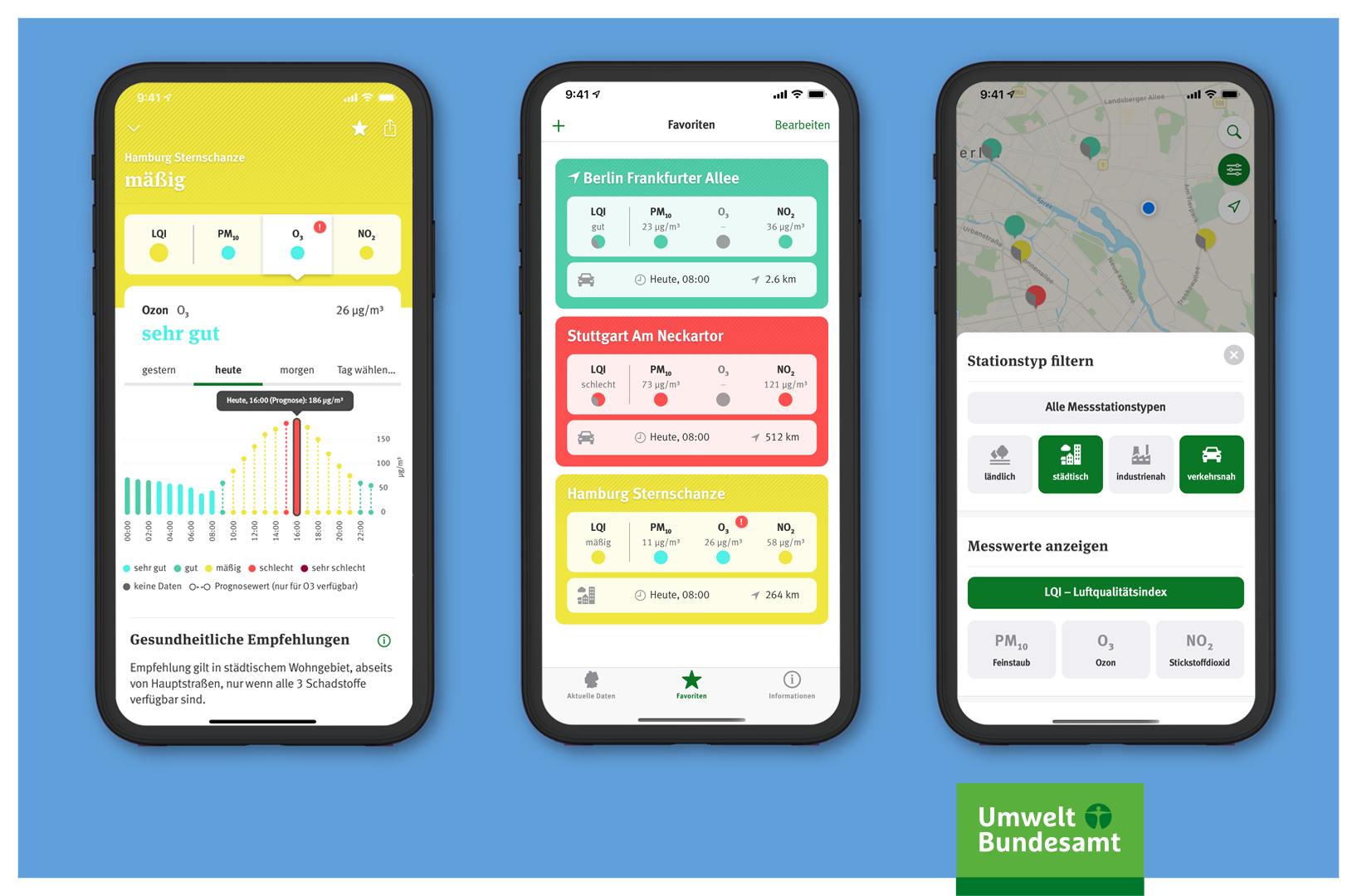 Most of the nationwide data of the more than 400 air monitoring stations originates from the monitoring networks of the federal states. The air quality index, which ranges from "very good" to "very poor", provides information at a glance about the air quality at each station. Depending on the level of exposure, the app gives health advice for outdoor activities. The app can also be set to send alerts in case of poor air quality.