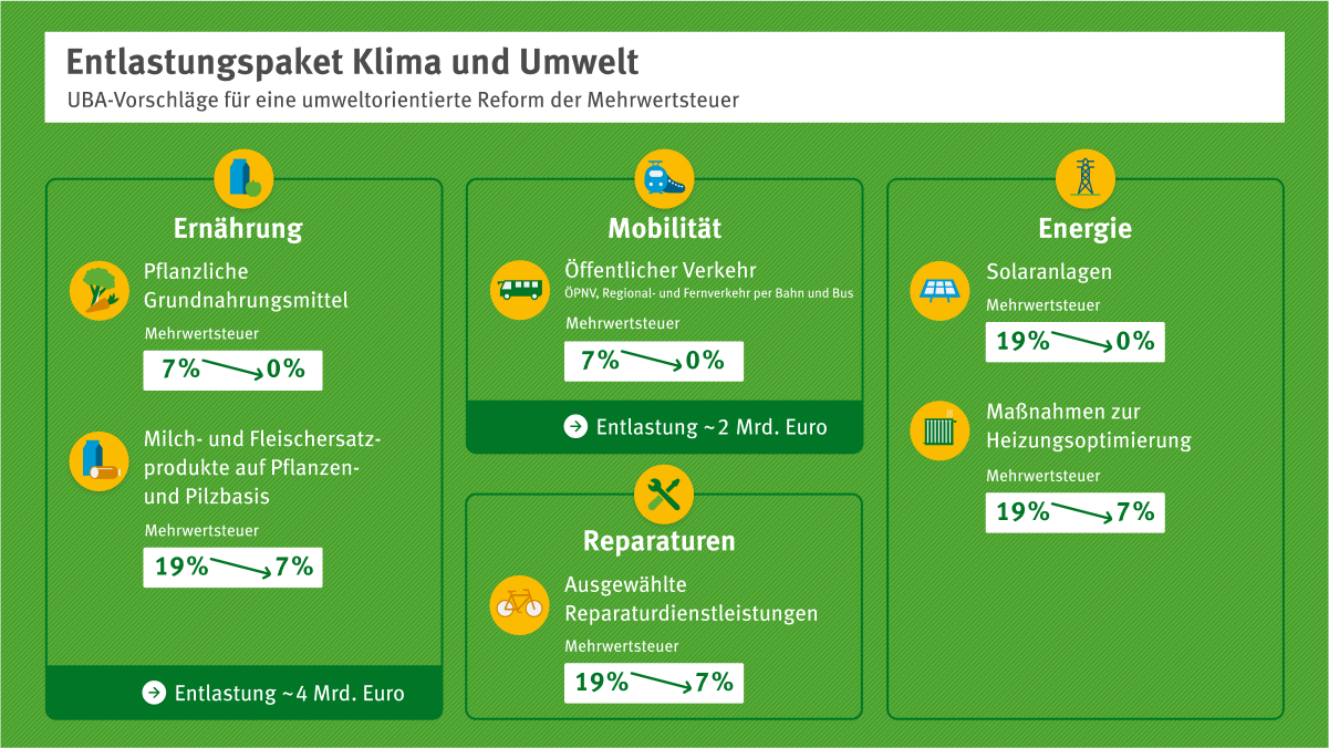 The VAT in Germany is regulated by a chaotic set of individual rules. Ecological concerns are not taken into consideration, social concerns only partially so. Some regulations even encourage environmentally harmful consumption patterns, for example the reduced VAT on animal products is an environmentally harmful subsidy because it favours environmentally harmful products.