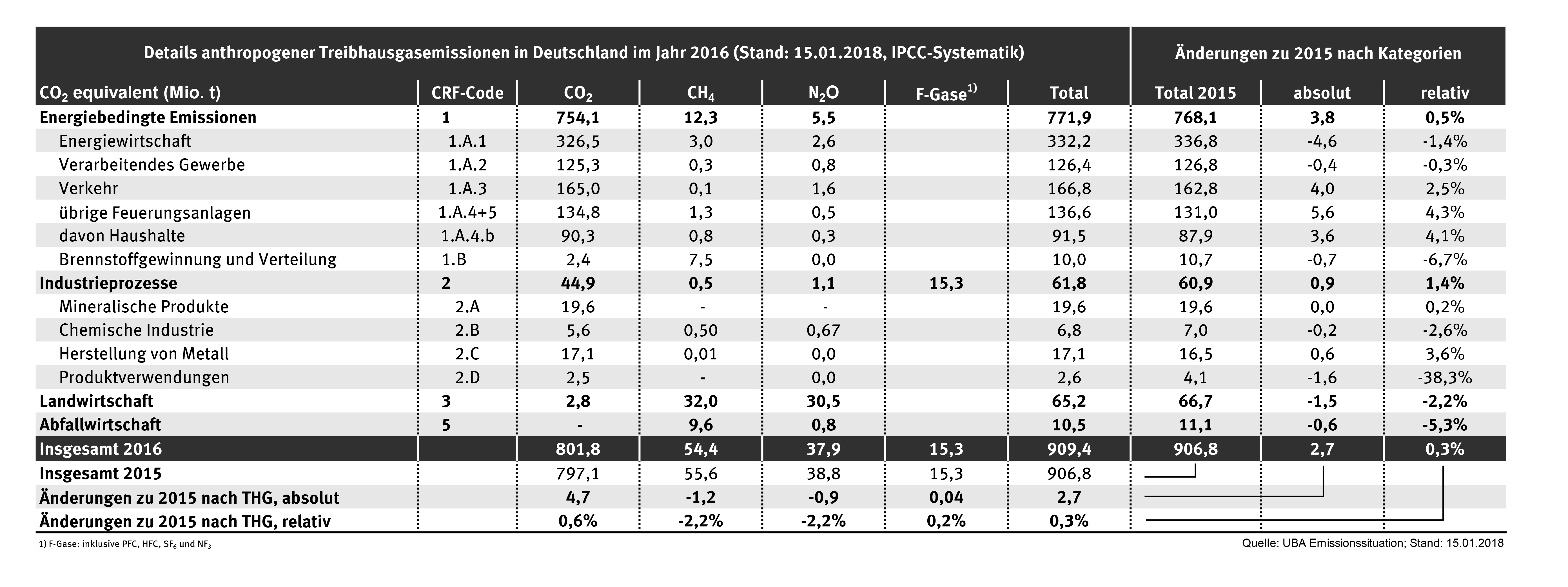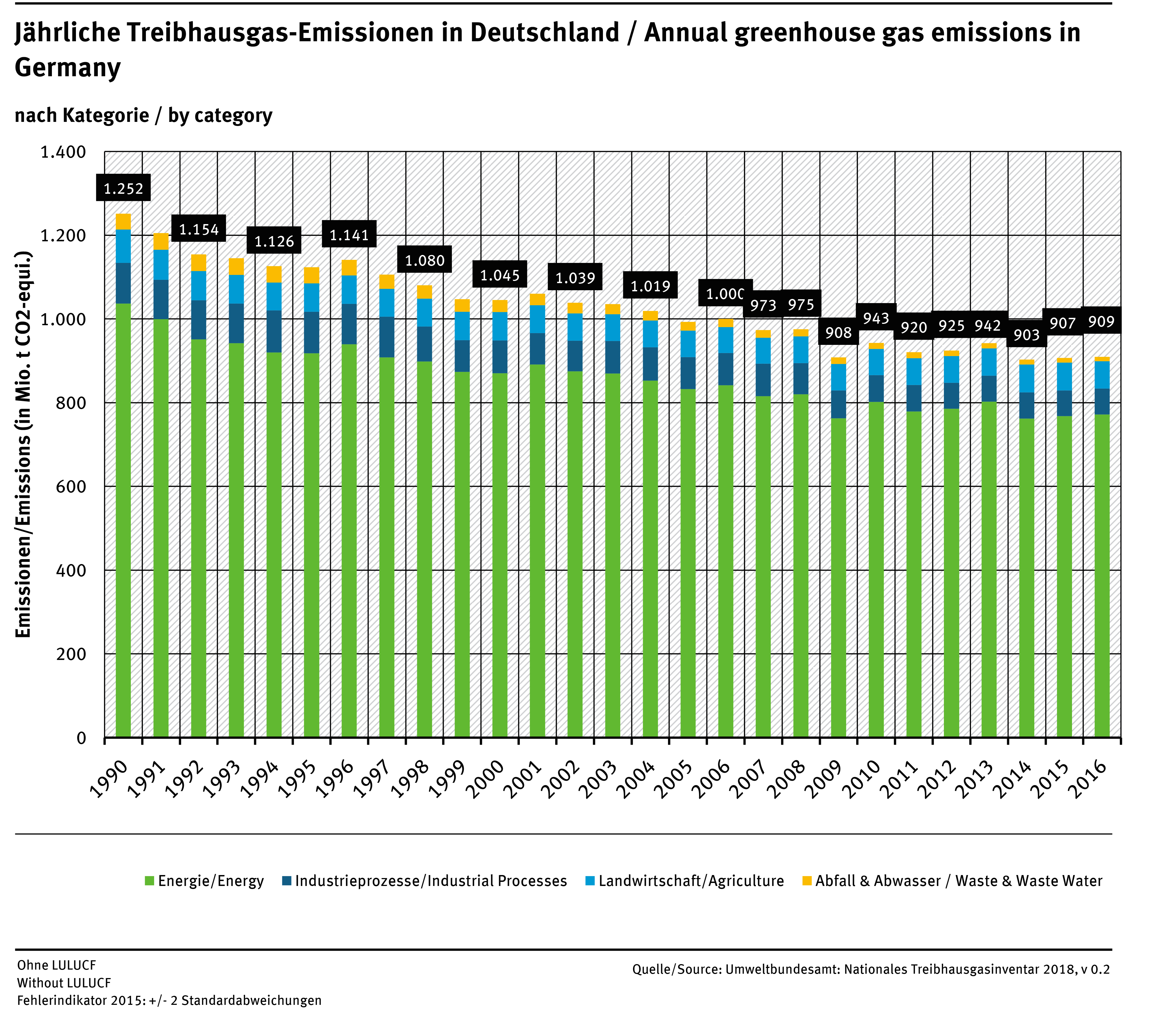In 2016, carbon dioxide (CO2), with a share of 88.2%, was once again the leading greenhouse gas, generated mainly by the combustion of fossil fuels. The remaining emissions were divided between methane (CH4), at 6 per cent, and nitrous oxide (N2O), at 4.2 percent, which were principally generated by agriculture. Compared to 1990, emissions of carbon dioxide fell by 23.9 percent, of methane by 54.4 per cent and of nitrous oxide by 41.1 percent.