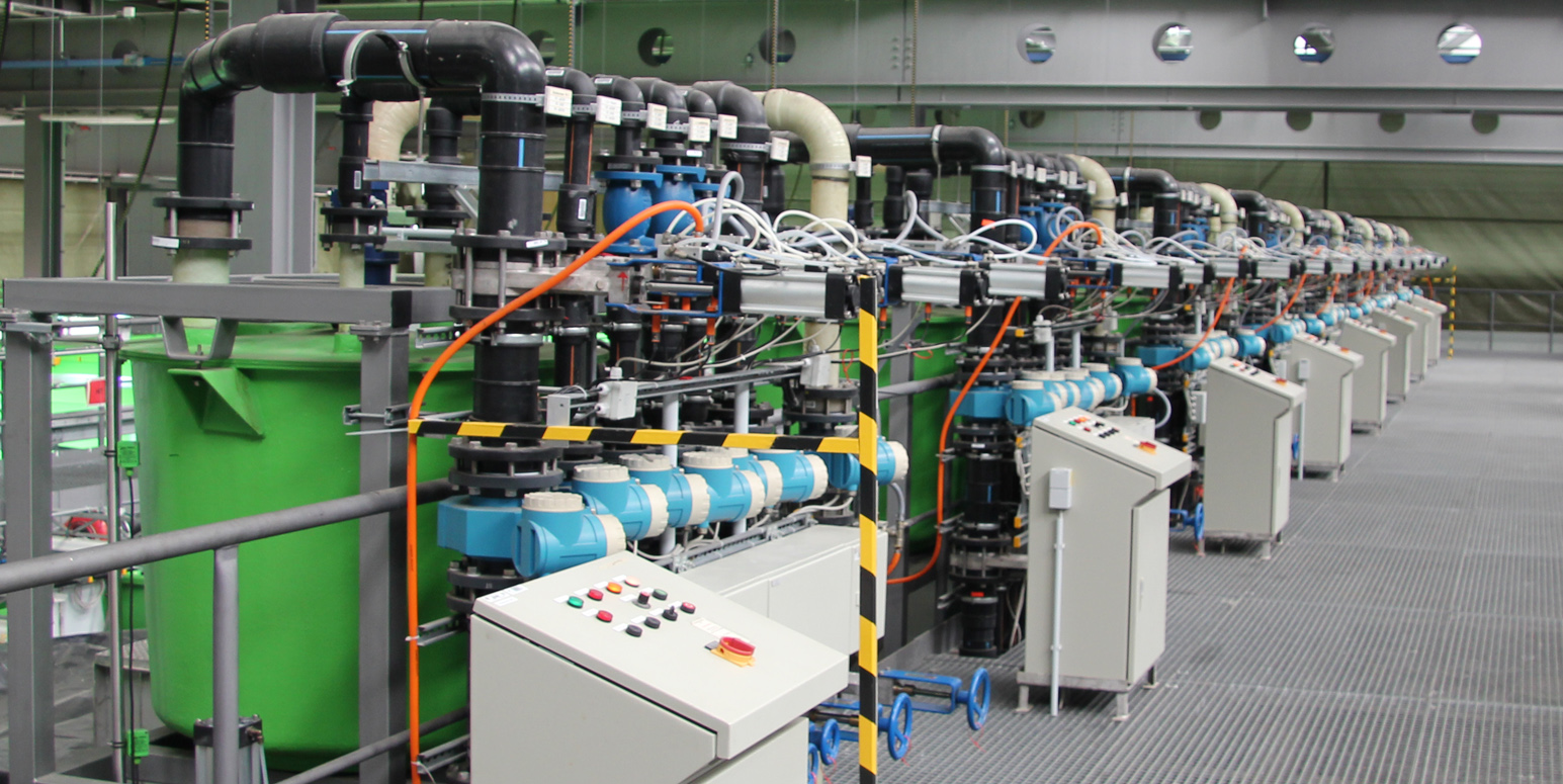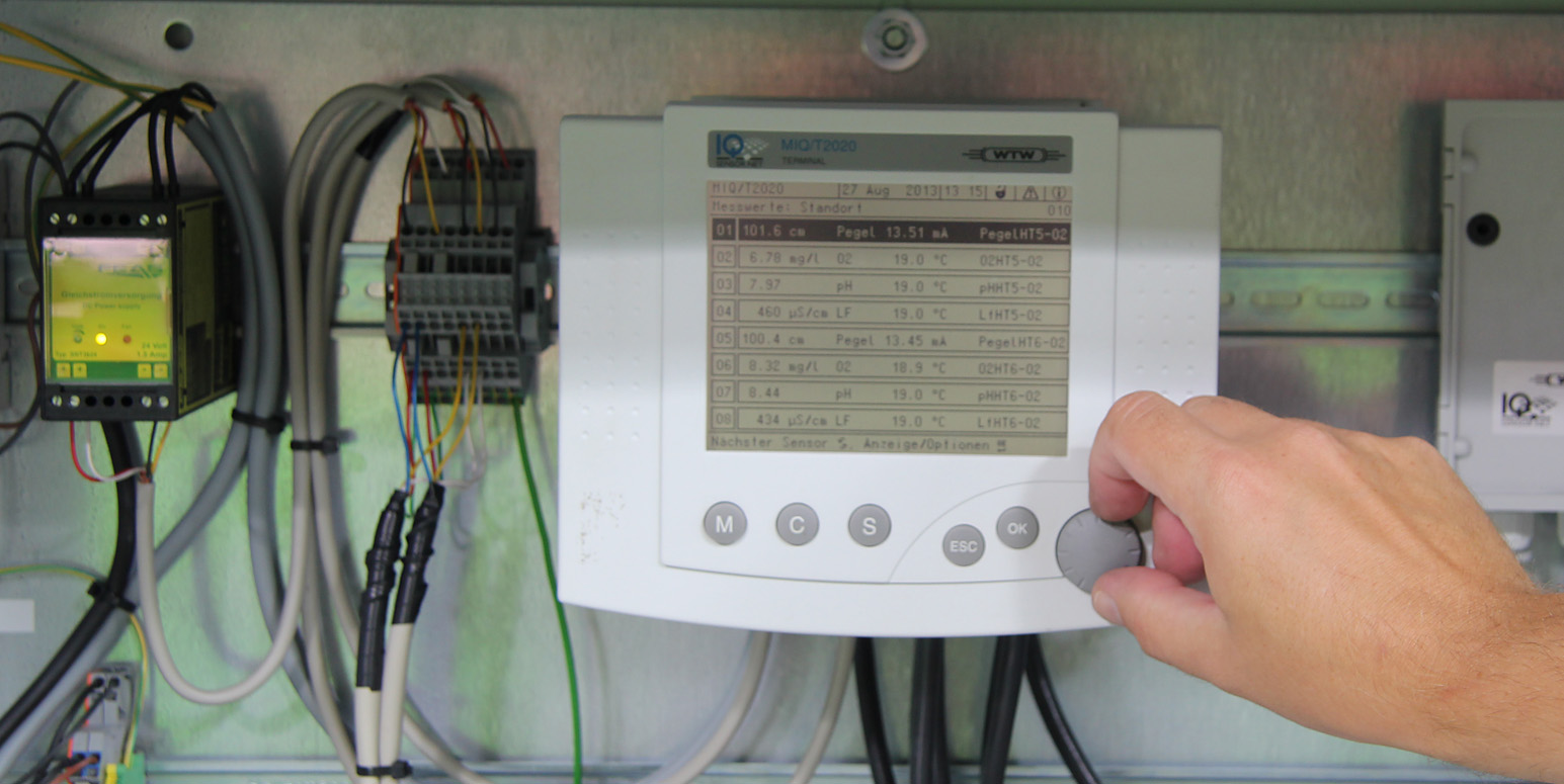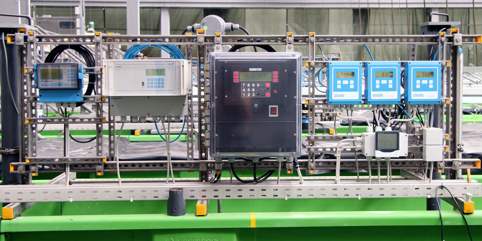 In the ponds the online measurements include oxygen, conductivity, pH, water temperature, and water level. The online data are transferred to the control room continuously.