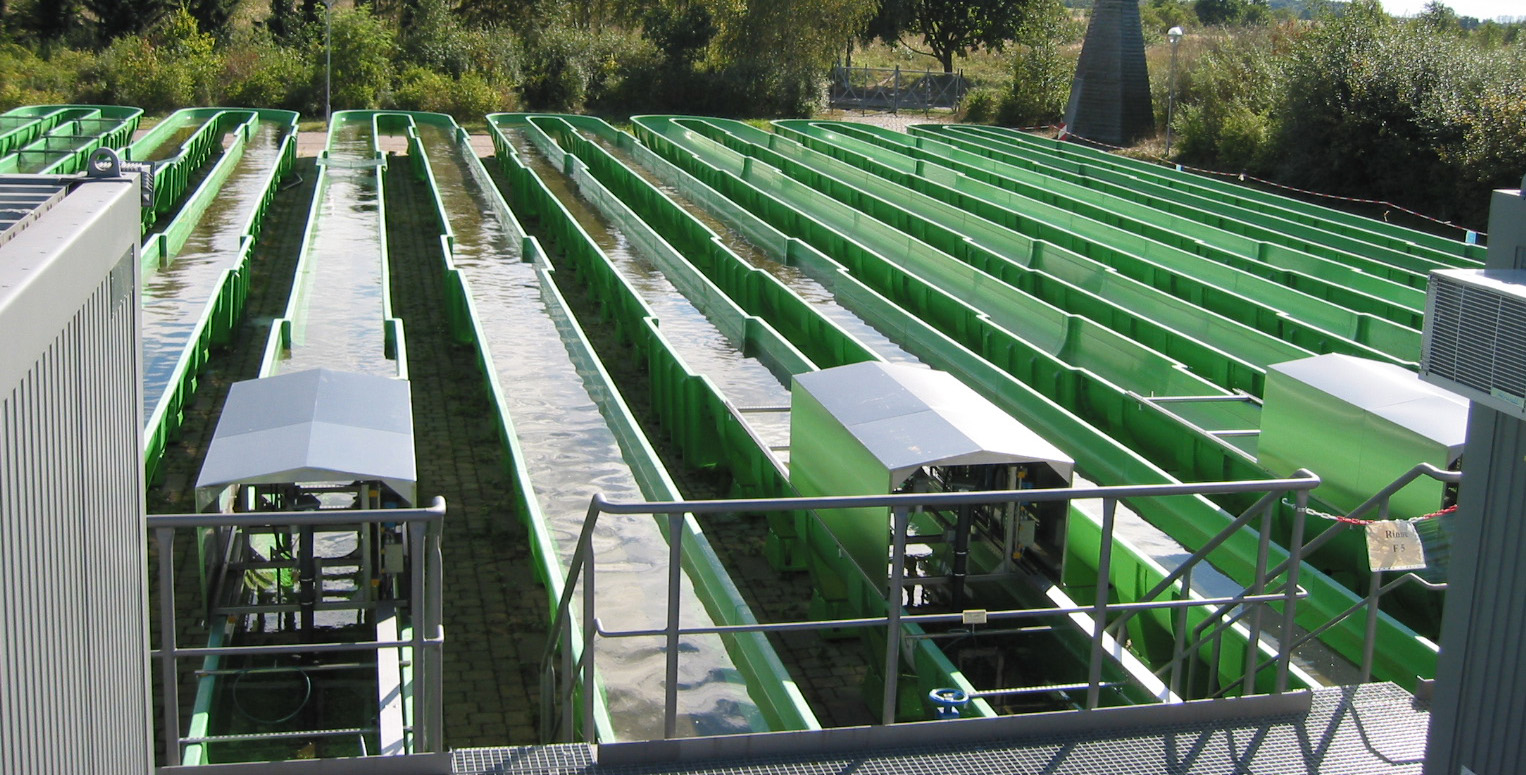 For transporting the water in the through-flow or circulation systems, each stream system is equipped with a specially-designed screw pump which does not harm aquatic organisms, including fish. The maximum flow velocity is 0.6 m/s (fast-flowing lowland river). For further details, please refer to the technical data sheet.