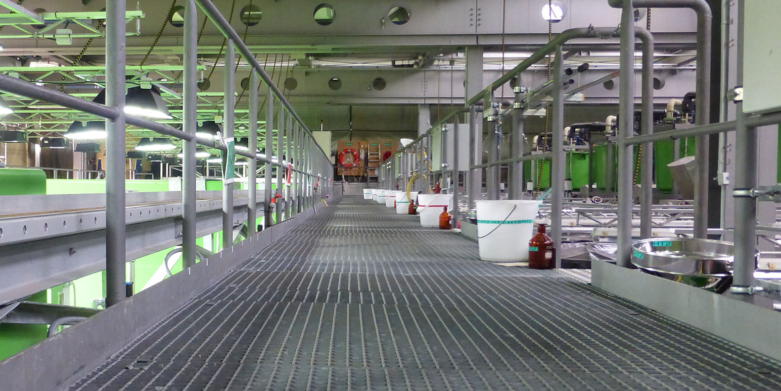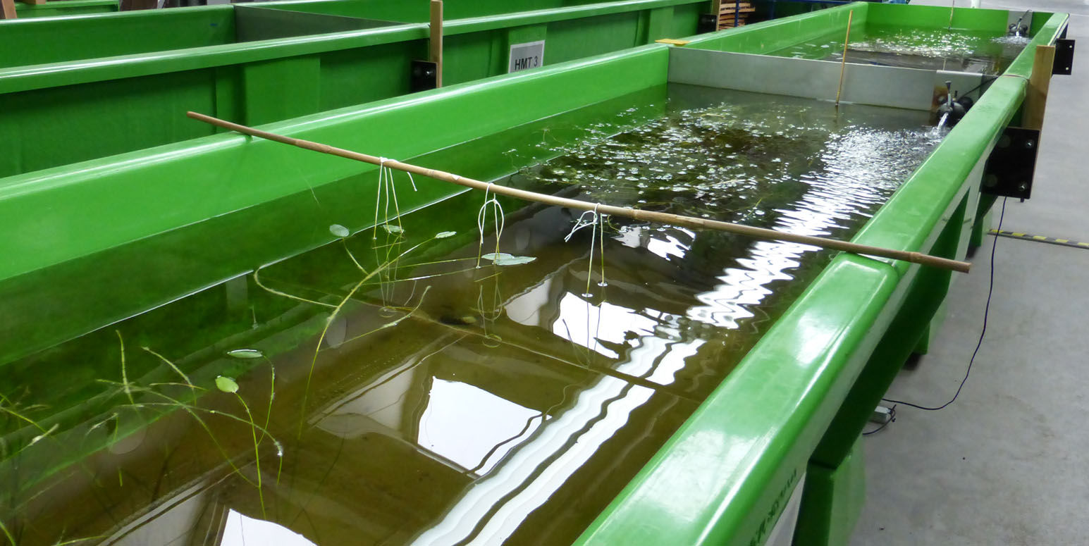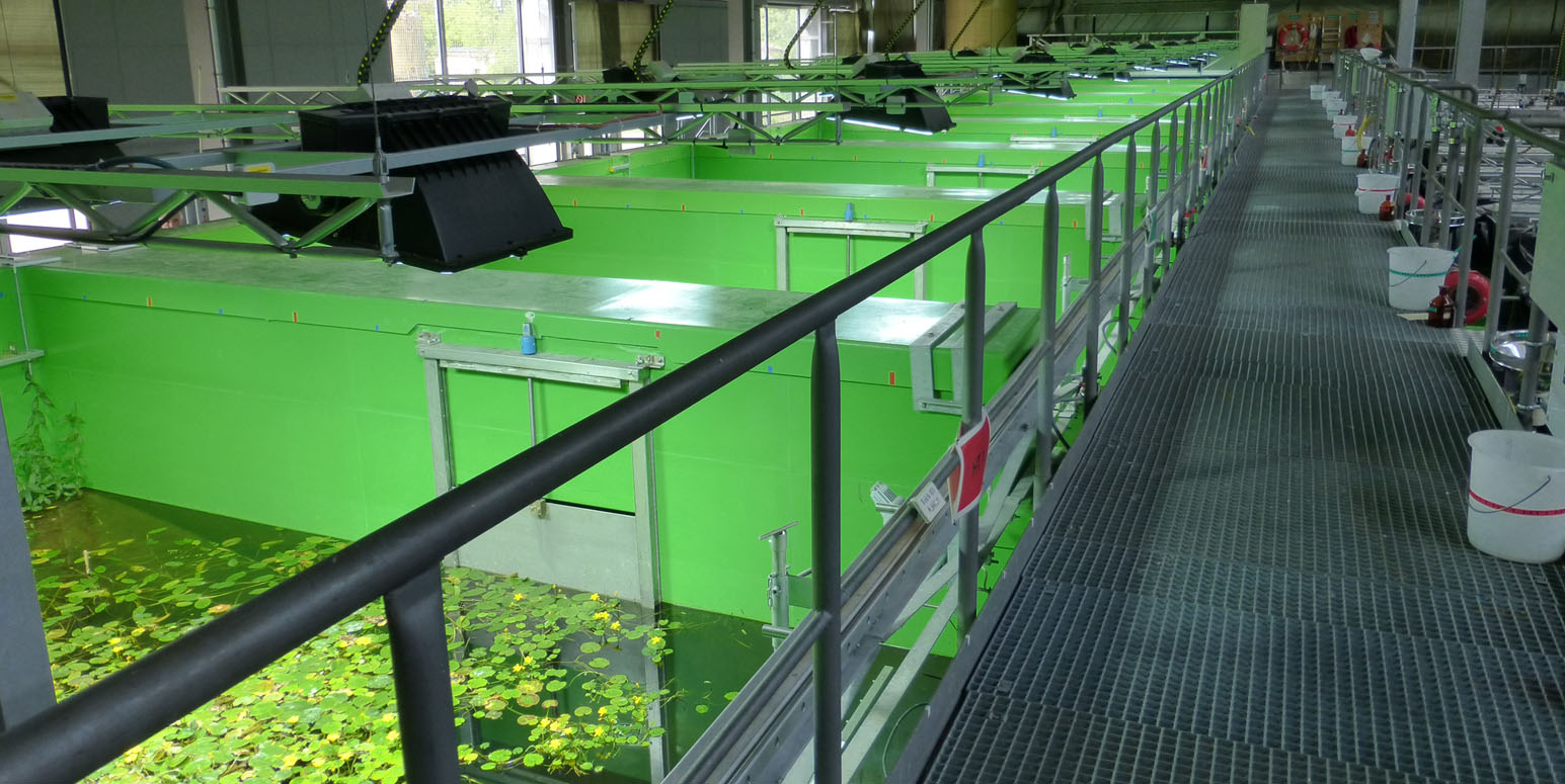 Up to 8 indoor and 8 outdoor stream mesocosms can be constructed by combining riffle segments and pools within a “modular” system. Each stream can be varied in length. For example, 16 independent streams (8 indoor and 8 outdoor), each up to 106 m in length or 2 streams of approx. 800 m length can be set up. The volume capacity is approx. 36,000 litres per a 106 m long stream. For further details, please refer to the technical data sheet.