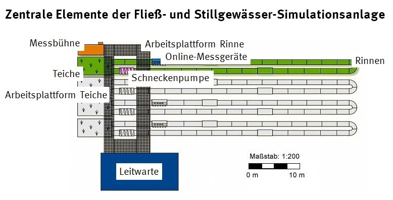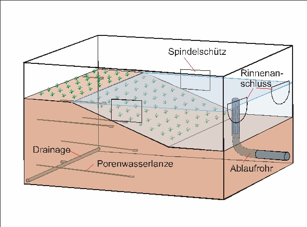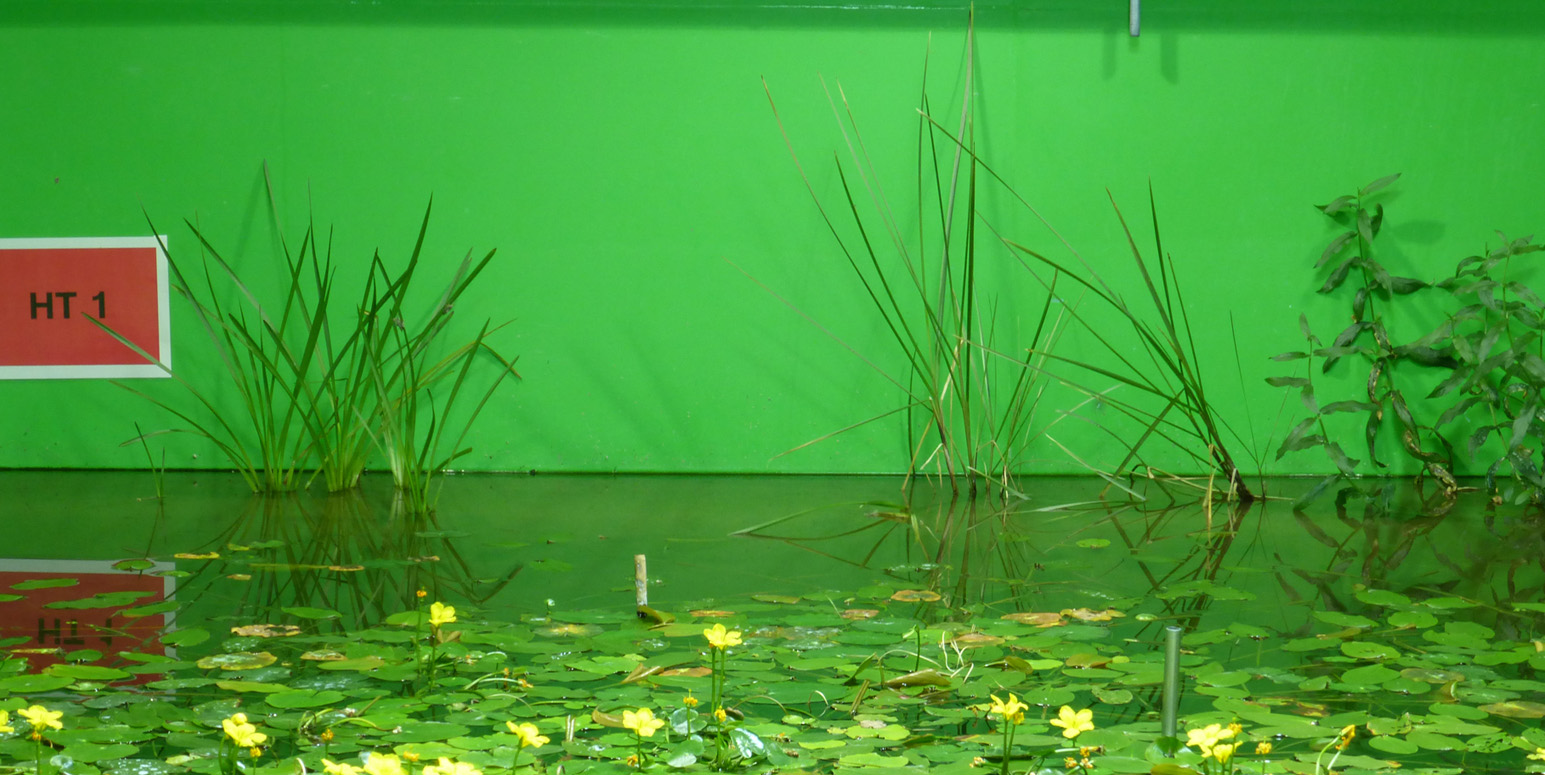 Ponds can be combined with streams to simulate “flow-through ponds”, or can be used independently for the simulation of stagnant water bodies. A passage running beneath the pond allows drainage control and sampling of bank filtrates. The maximum overall capacity of each pond is around 55,000 litres.