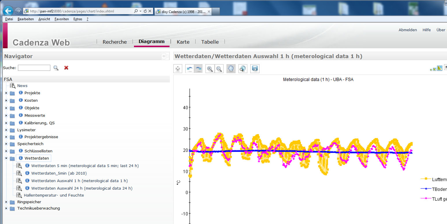 The ponds and streams of the FSA are equipped with an online measurement system, which also includes the meteorological station at the field station of the UBA. Every 10 s, up to 400 data are measured and temporarily stored in a Round Robin database (RRDB). Depending on the project requirements, parts of the data will be stored half automatically or aggregated data (e.g. mean per hour) will be transferred automatically into the FSA-DB. For each measurement device, limit values can be set separately e.g. for an email notification system in case of system failure (alarm system).