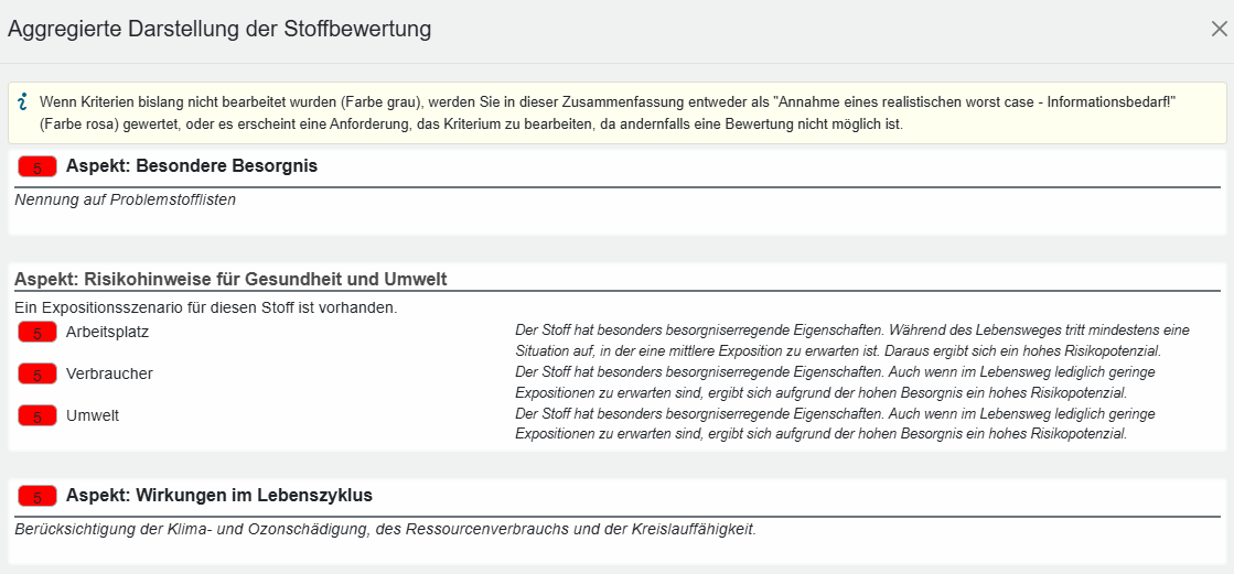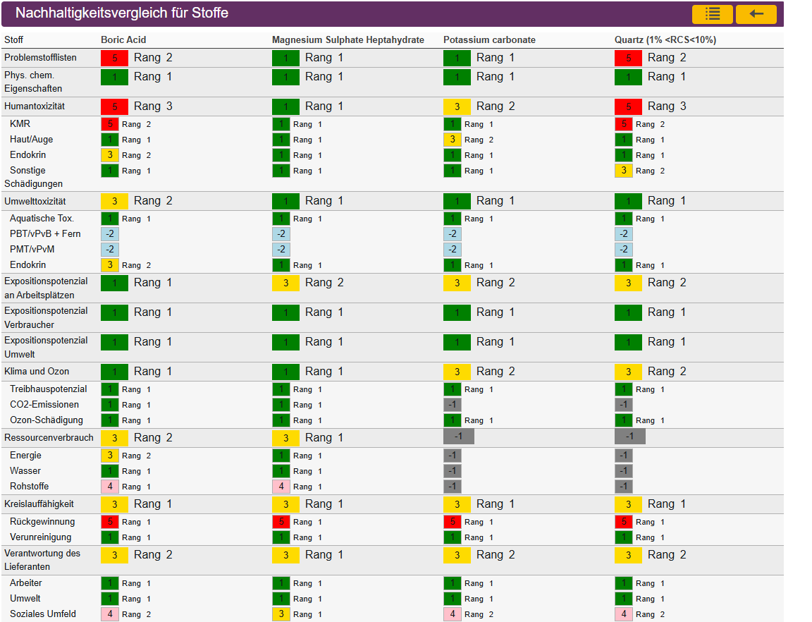 The data entered for each chemical is compared with the indicators stored in ChemSelect, resulting in the evaluation colour.